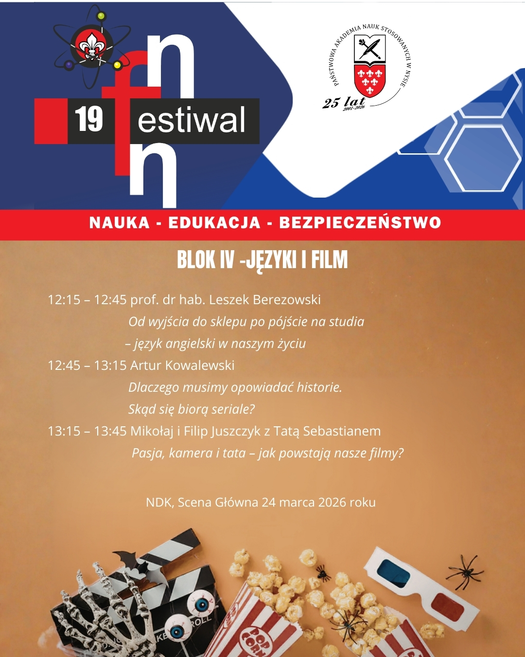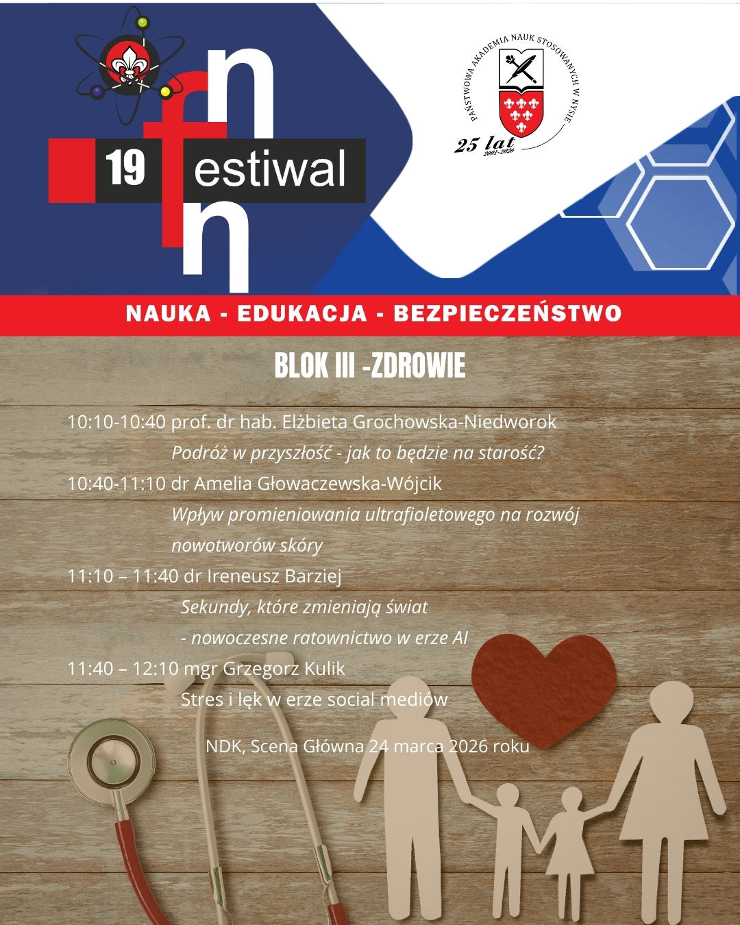 Pierwszy dzień Festiwalu odbędzie się w dniu 24 marca 2026r. w Nyskim Domu Kultury, gdzie czeka na Państwa szereg wykładów popularnonaukowych wygłoszonych przez pracowników Uczelni oraz zaproszonych gości.
