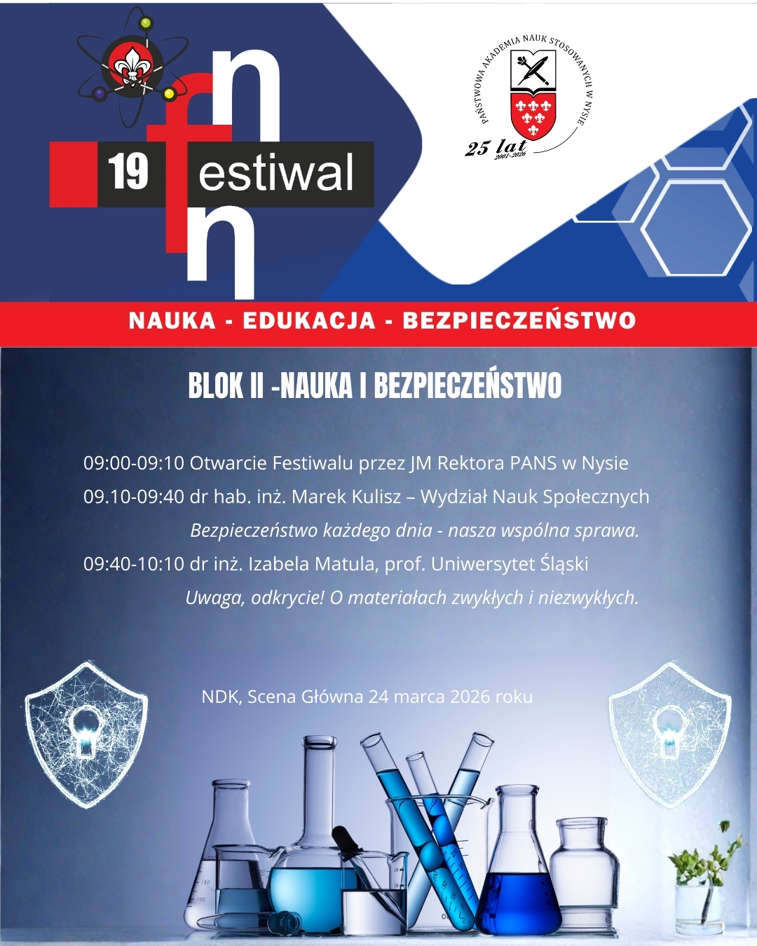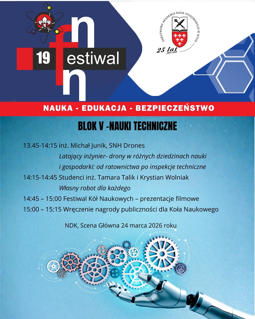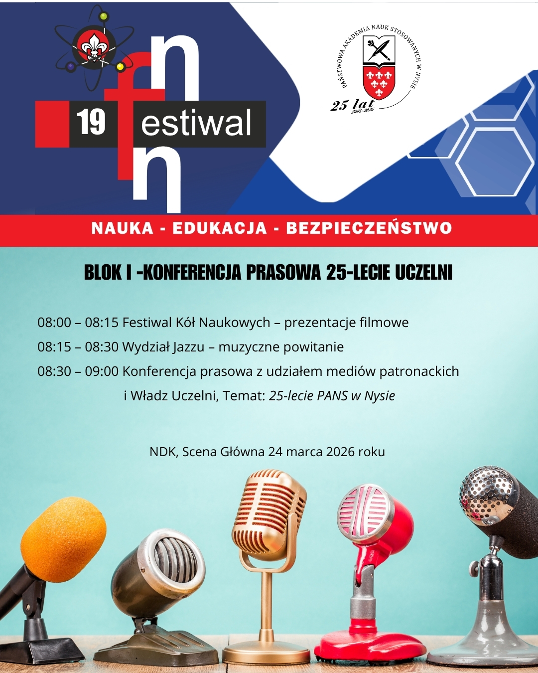 W dniach 24-25 marca 2026 roku Państwowa Akademia Nauk Stosowanych w Nysie zaprasza na wyjątkowe wydarzenie – Nyski Festiwal Nauki, który w tym roku będzie wyjątkowy i rozpocznie obchody Jubileuszu 25-lecia naszej Uczelni. Celem tej inicjatywy jest popularyzacja nauki w jej praktycznym wymiarze oraz pokazanie, jak badania naukowe mogą wpływać na nasze codzienne życie.
