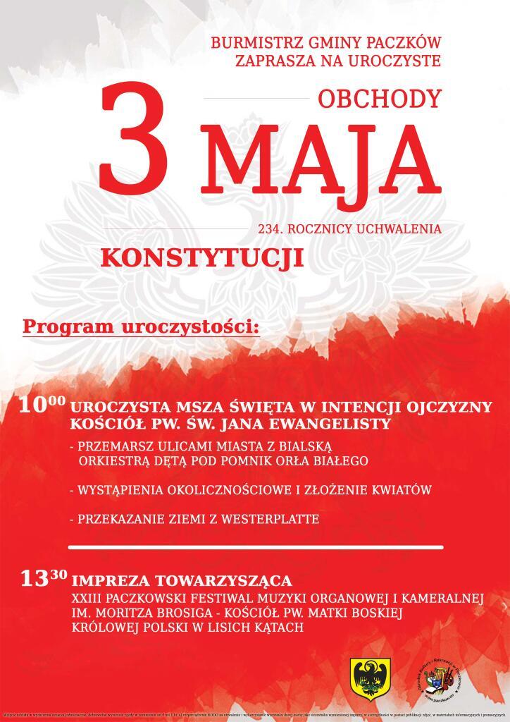 Burmistrz Gminy Paczków – Artur Rolka zaprasza na uroczystości 3 Maja. Szczegóły na plakacie.