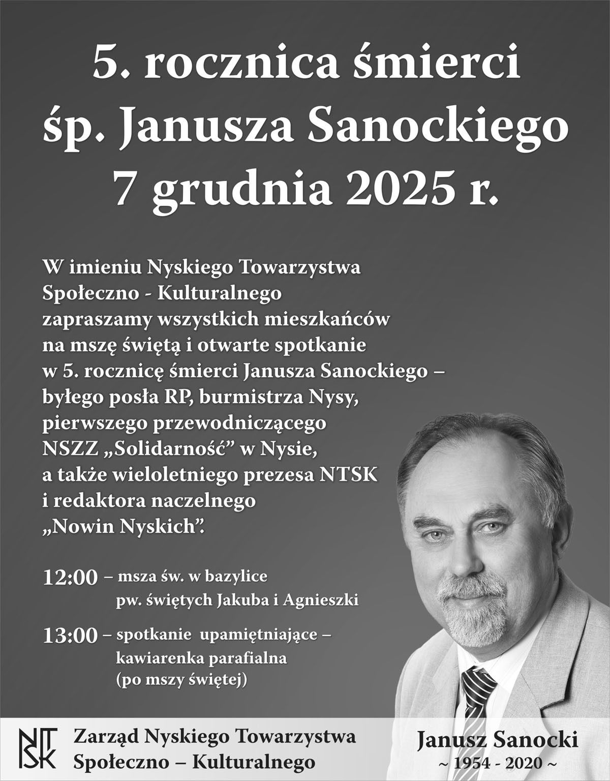 W najbliższą niedzielę 7 grudnia, w bazylice Świętego Jakuba i Agnieszki odprawiona zostanie Msza Święta w intencji Janusza Sanockiego, a po nabożeństwie zaplanowano spotkanie wspomnieniowe w kawiarence parafialnej (ok. godz. 13.00).