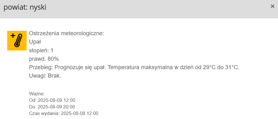 Ostrzeżenie obowiązuje od 9. sierpnia. Według prognoz spodziewane są upały pierwszego stopnia, a temperatura może wynieść nawet 31 stopni