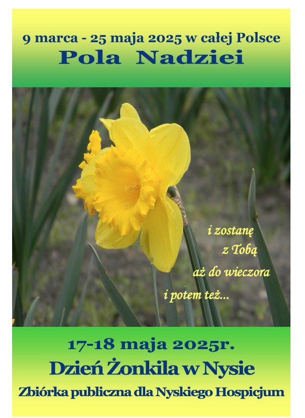 17 i 18 maja 2025 roku, odbędzie się na terenie Nysy ogólnopolska akcja “Pola Nadziei” Wolontariusze ubrani w żółte koszulki będą kwestować na rzecz nyskiego hospicjum, oraz wręczać ofiarodawcom żonkile – symbol nadziei.