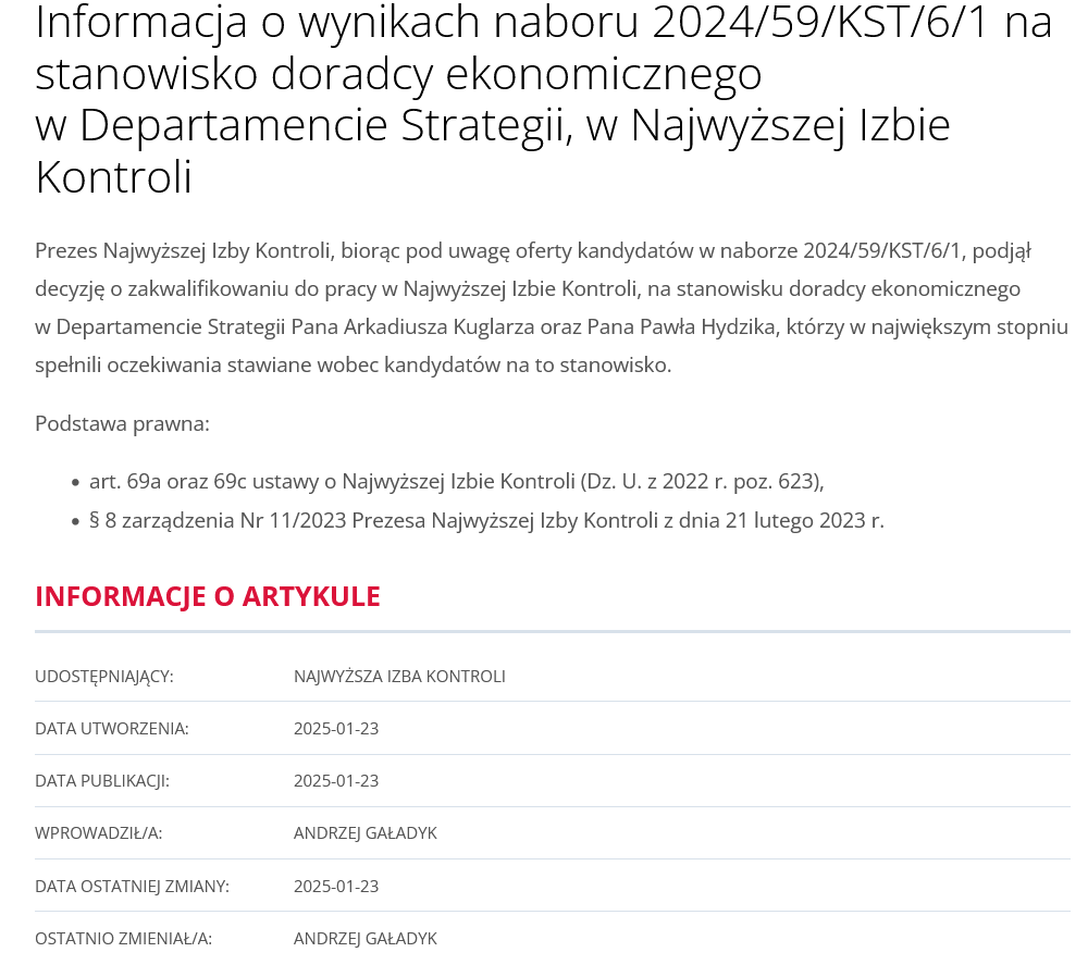 Dziś już wiemy, że Arkadiusz Kuglarz będzie pracował w Najwyższej Izbie Kontroli na stanowisku doradcy ekonomicznego w Departamencie Strategii.