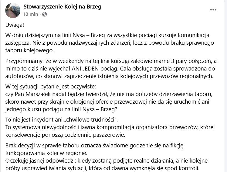 W dniu dzisiejszym na linii Nysa – Brzeg za wszystkie pociągi kursuje komunikacja zastępcza. Nie z powodu nadzwyczajnych zdarzeń, lecz z powodu braku sprawnego taboru kolejowego. Przypominamy że w weekendy na tej linii kursują zaledwie marne 3 pary połączeń, a mimo to dziś nie wyjechał ANI JEDEN pociąg. Cała obsługa została sprowadzona do autobusów, co stanowi zaprzeczenie istnienia kolejowych przewozów regionalnych – informuje w mediach społecznościowych Stowarzyszenie Kolej na Brzeg.