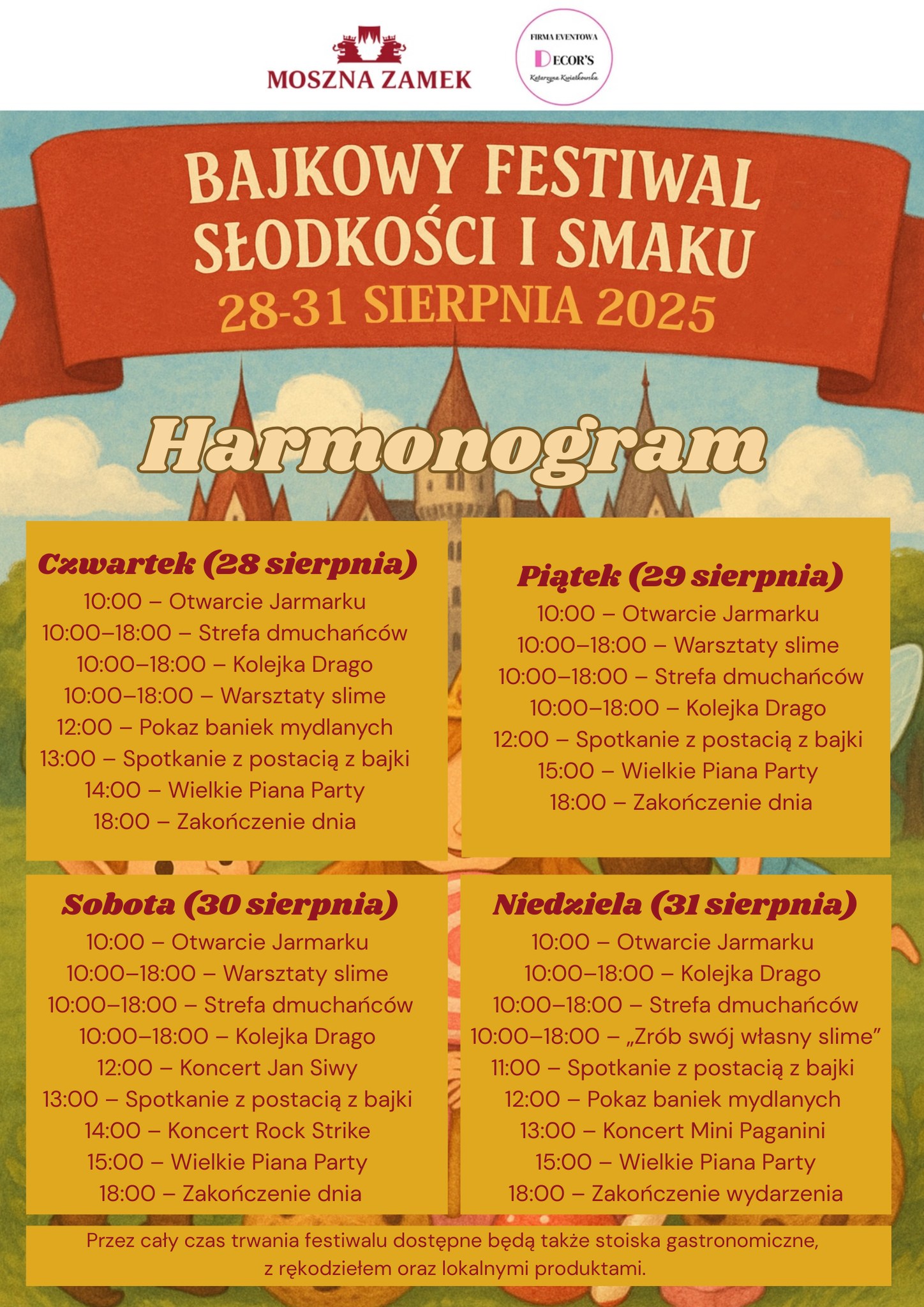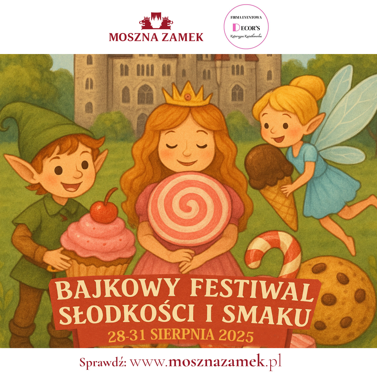 Z radością zapraszamy Was na wyjątkowy Bajkowy Festiwal Słodkości i Smaku, który odbędzie się na malowniczym terenie Zamku Moszna w dniach 28-31 sierpnia! Przygotujcie się na niezapomnianą podróż do świata słodkich rozkoszy i magicznych smaków – zachęcają organizatorzy.