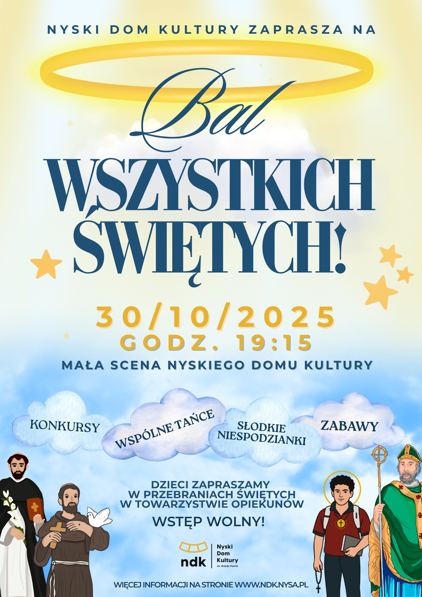 Już w czwartek, 30 października 2025 r. o godz. 19:15 spotykamy się na małej scenie Nyskiego Domu Kultury, by wspólnie świętować radość nieba! Zachęcamy wszystkie dzieci do przebrania się za wybranego świętego lub świętą – niech to będzie wieczór pełen kolorów, uśmiechu i inspiracji – informuje Nyski Dom Kultury.