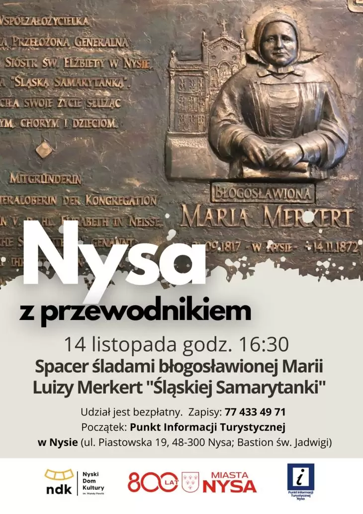 14 listopada 2023 r. godz. 16:30 – spacer śladami błogosławionej Marii Luizy Merkert (zgłoszenia 77 433 49 71, początek Punkt Informacji Turystycznej)