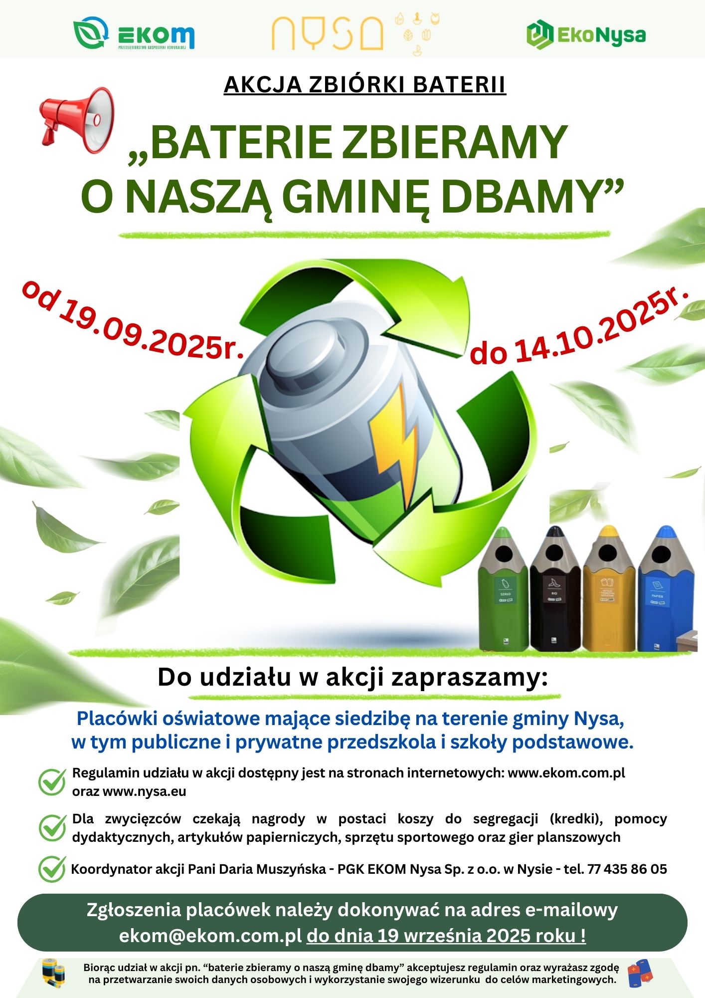Wraz z rozpoczęciem roku szkolnego zachęcamy do wzięcia udziału w akcji zbiórki baterii pn. “BATERIE ZBIERAMY O NASZĄ GMINĘ DBAMY” – Przedsiębiorstwo Gospodarki Komunalnej EKOM Sp z o o w Nysie
