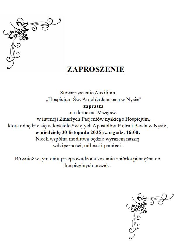 Stowarzyszenie Auxilium “Hospicjum Św. Arnolda Janssena w Nysie” zaprasza na doroczną Mszę Świętą w intencji zmarłych pacjentów nyskiego hospicjum.