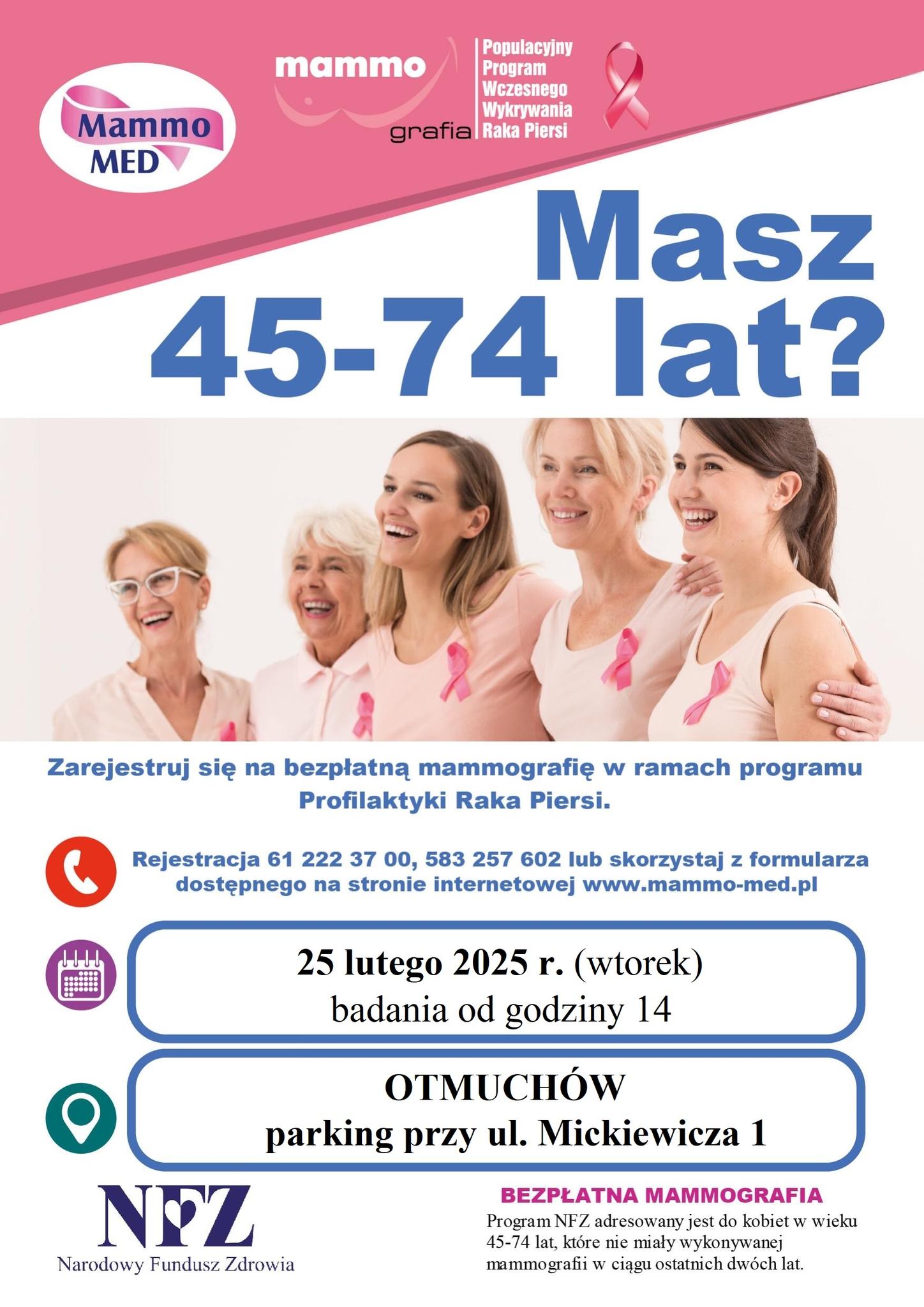 Otmuchów zachęca kobiety w wieku 45-74 lat do skorzystania z bezpłatnych badań mammograficznych w ramach Programu Profilaktyki Raka Piersi finansowanego przez NFZ.