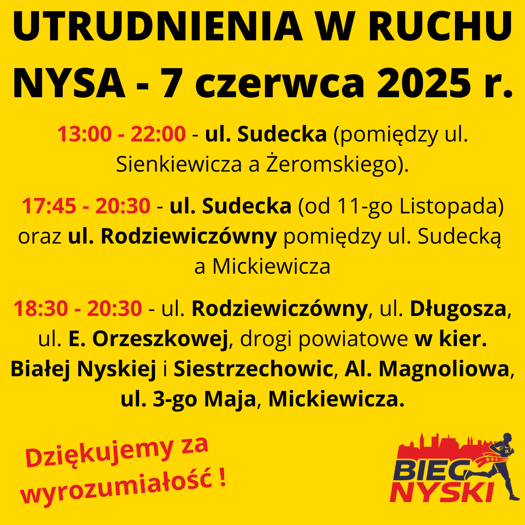 UTRUDNIENIA W RUCHU NYSA – 7 czerwca 2025 r. (sobota), z powodu organizacji XII IONWAY Biegu Nyskiego, w którym weźmie udział rekordowa liczba uczestników.
