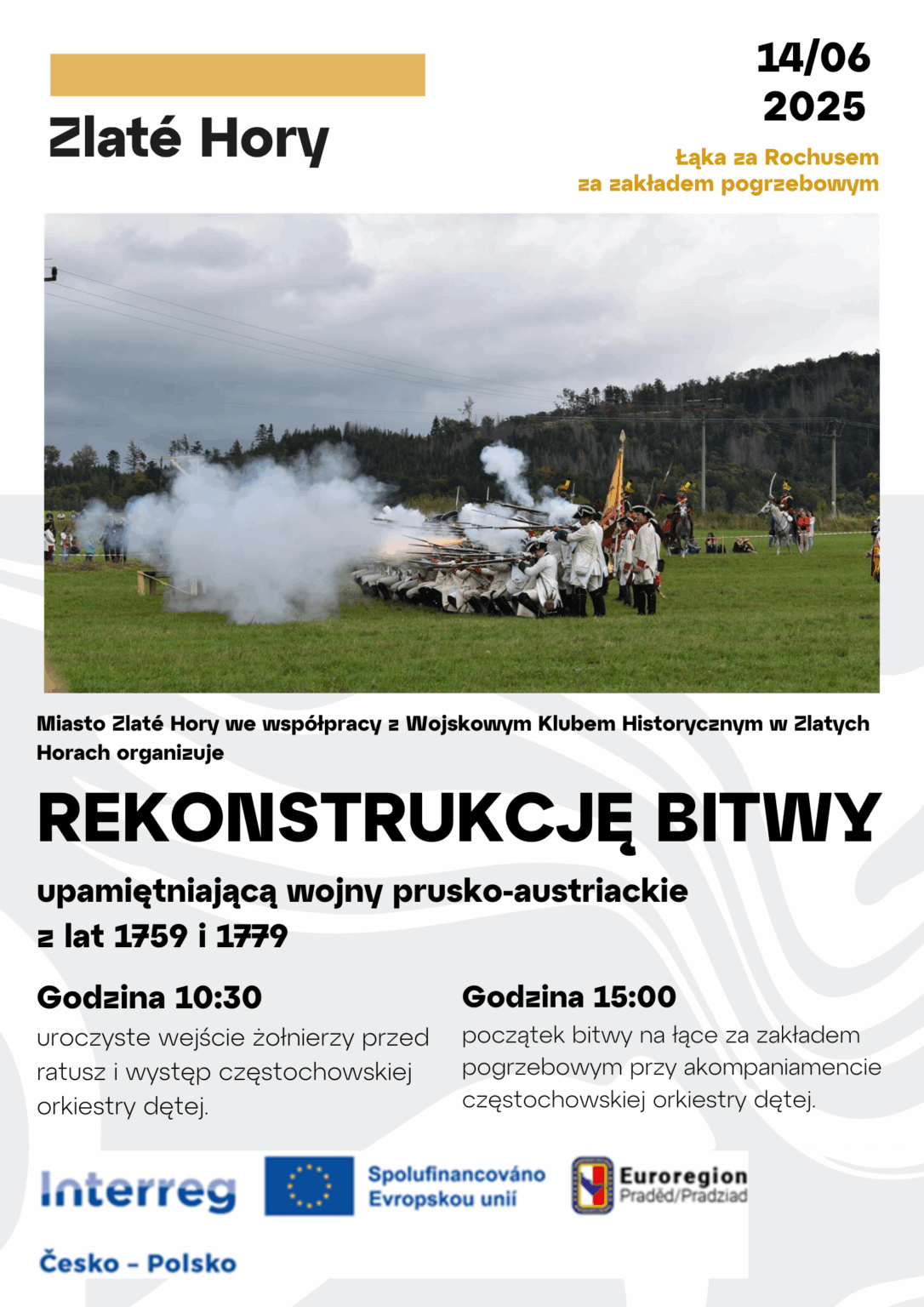 Miasto Zlaté Hory we współpracy z Klubem Historii Wojskowości w Zlatých Horach zapraszają na Bitwę Historyczną, upamiętniającą wojny prusko-austriackie z 1759 i 1779 roku. Bitwa została zaplanowana w dniu 14 czerwca, a wstęp jest bezpłatny.