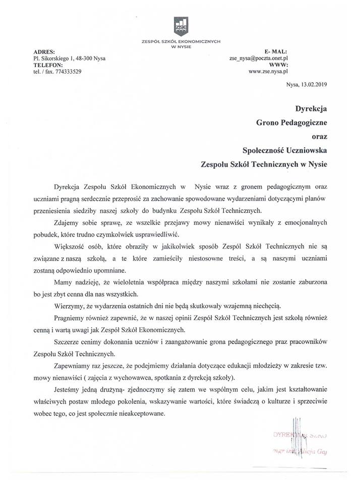 W związku z tymi wydarzeniami dyrekcja Zespołu Szkół Ekonomicznych wystosowała oficjalne przeprosiny: