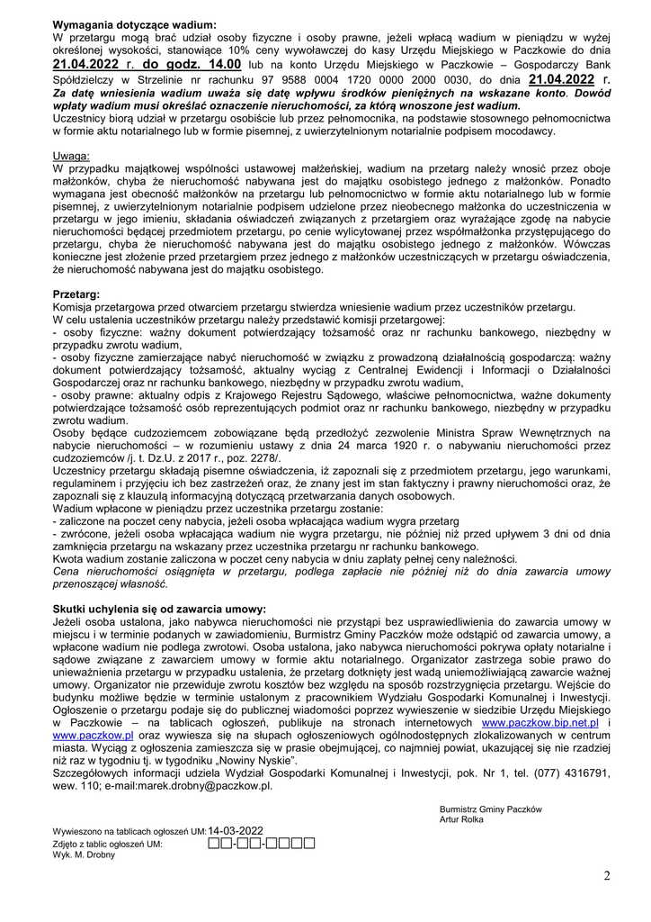 Burmistrz Gminy Paczków ogłosił I przetarg ustny nieograniczony dotyczący zbycia nieruchomości gruntowej zabudowanej położonej w Paczkowie przy ul. Sienkiewicza 20, działka 933 o pow. 0,0298 ha.