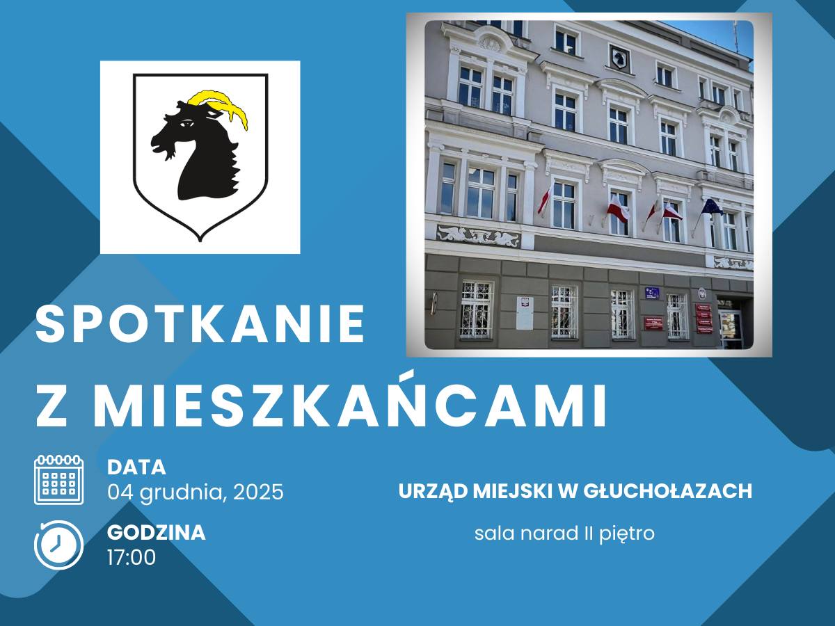 Burmistrz Głuchołaz oraz Przewodniczący Rady Miejskiej w Głuchołazach serdecznie zapraszają na spotkanie z mieszkańcami, które odbędzie się w dniu 4 grudnia 2025 roku o godzinie 17:00, w Urzędzie Miejskim w Głuchołazach na sali narad na II piętrze.