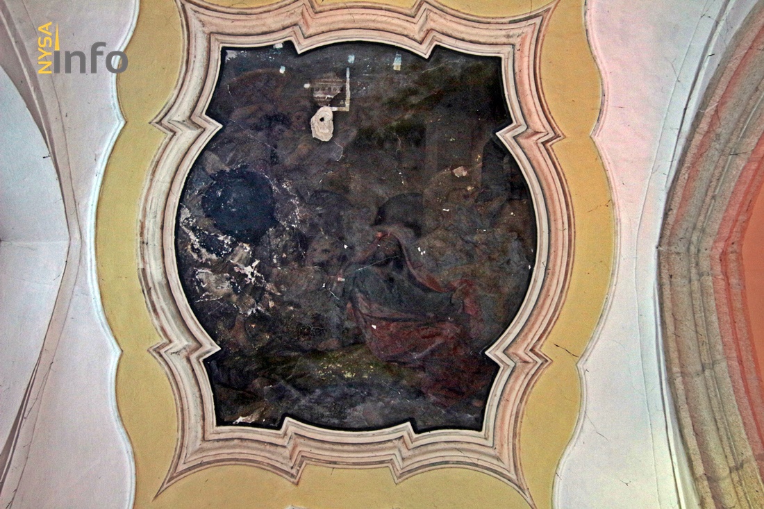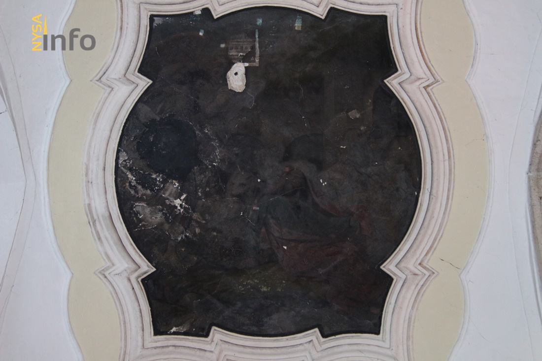 Podnosząc głowę do góry dziś niestety widzimy niemal w pełni czarną powierzchnię. Barokowego freski zostały praktycznie w całości przykre solidną warstwą brudu i być może sadzy wskutek pożaru w 1945 roku.