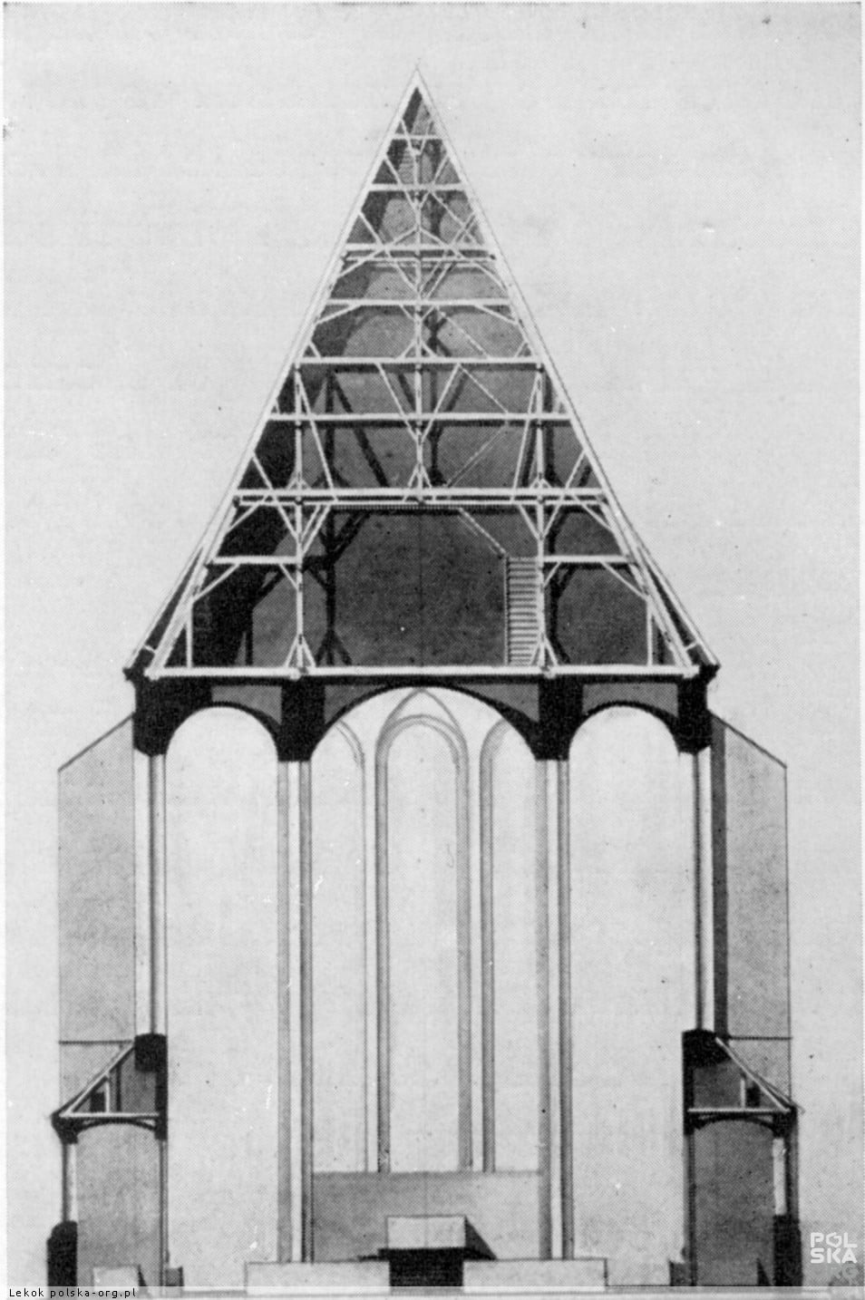 Do czasów ostatniej wojny strych to była 9-poziomowa konstrukcja wykonana z drewna dębowego. Na portalu polska-org.pl opublikowano przedwojenne zdjęcie przekroju świątyni. Miejsce to ma ogromną kubaturę, bowiem dach ma wysokość aż 27 metrów.