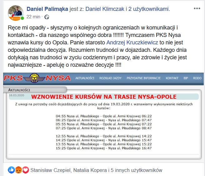 Decyzja o tym, aby wznowić kursy spotkała się z ostrą reakcją radnego powiatowego Daniela Palimąki, który zamieścił w tej sprawie wpis na facebooku.