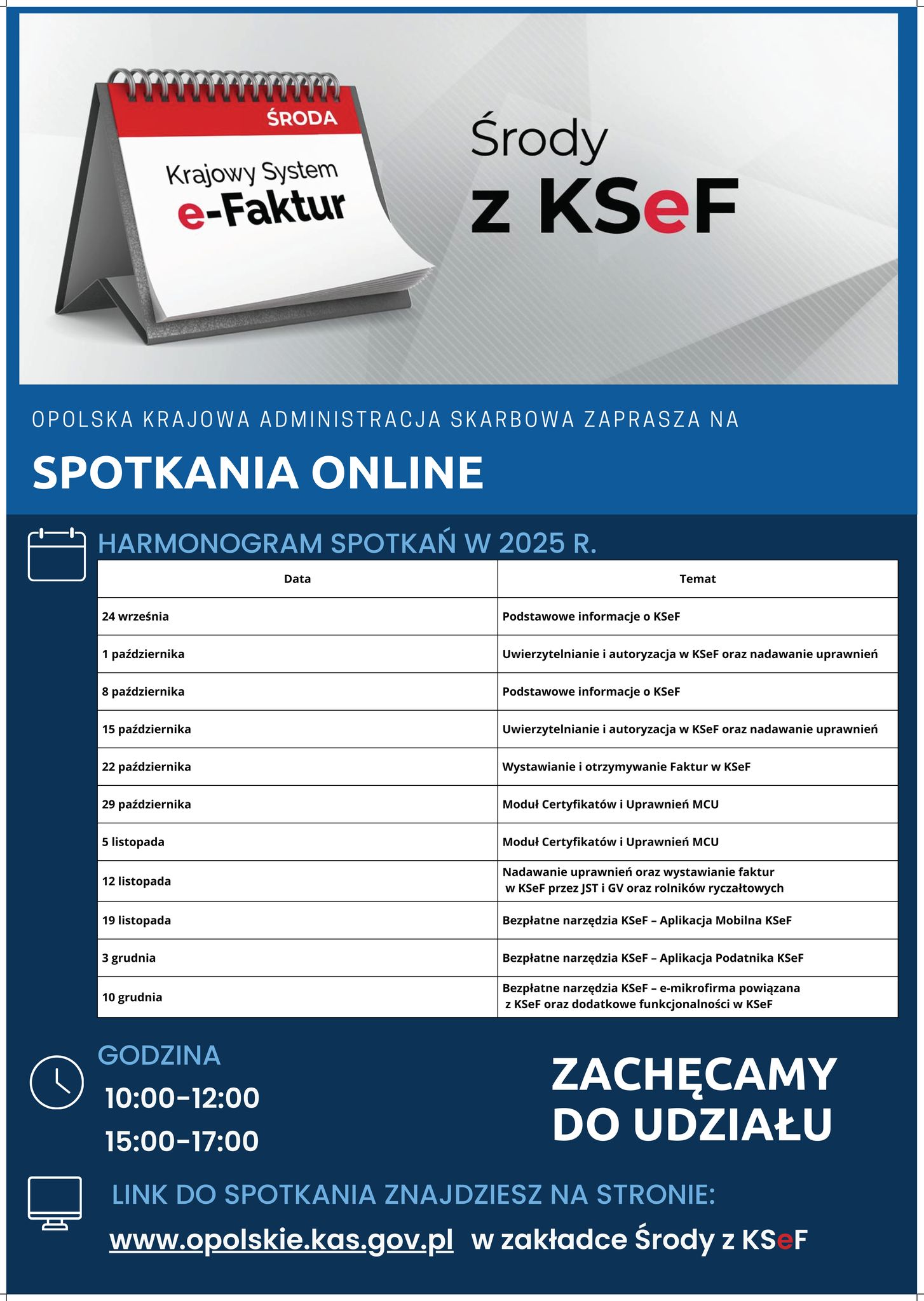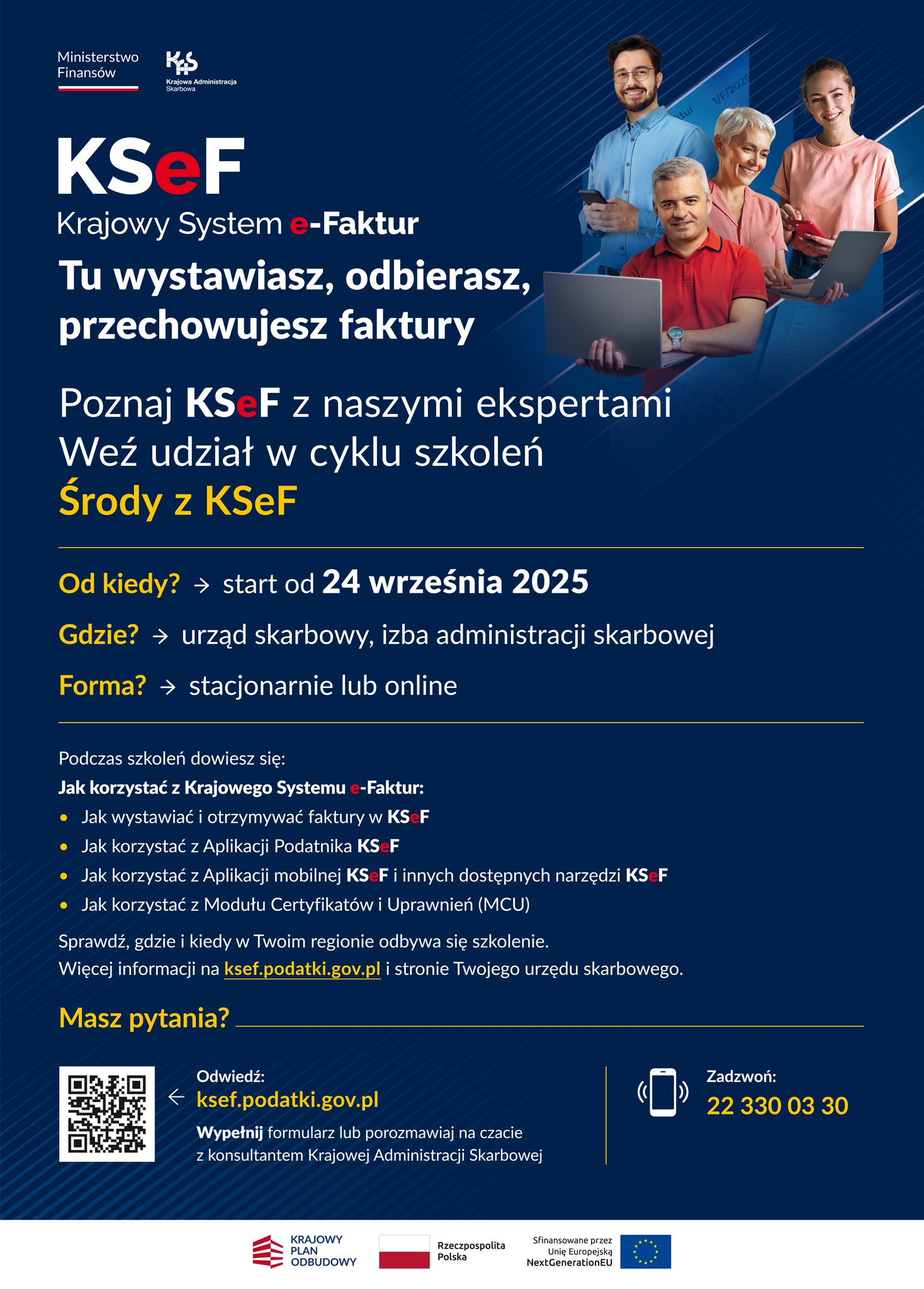 „Środy z KSeF” to cykl bezpłatnych szkoleń i webinarów organizowanych przez resort finansów, którego celem jest pomoc przedsiębiorcom w przygotowaniach do wdrożenia obowiązkowego Krajowego Systemu e-Faktur. Spotkania obywają się w środy – zarówno stacjonarnie, jak i on-line – aby każdy mógł wziąć w nich udział w dogodnej formie.