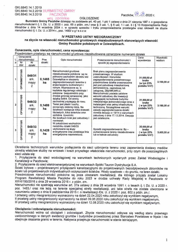 Burmistrz Gminy Paczków ogłosił IV przetarg ustny nieograniczony na zbycie na własność nieruchomości gruntowych niezabudowanych położonych w Dziewiętlicach.