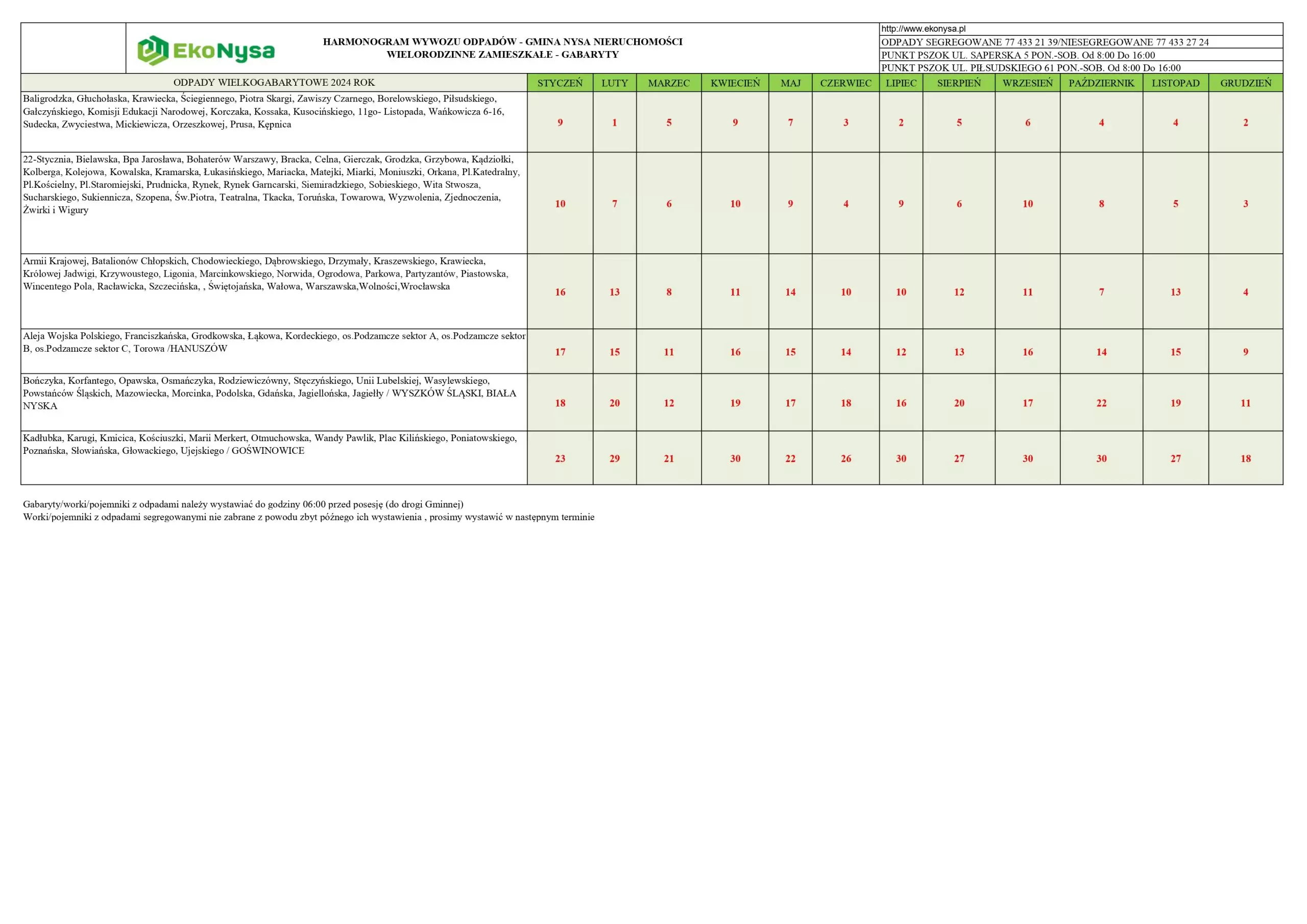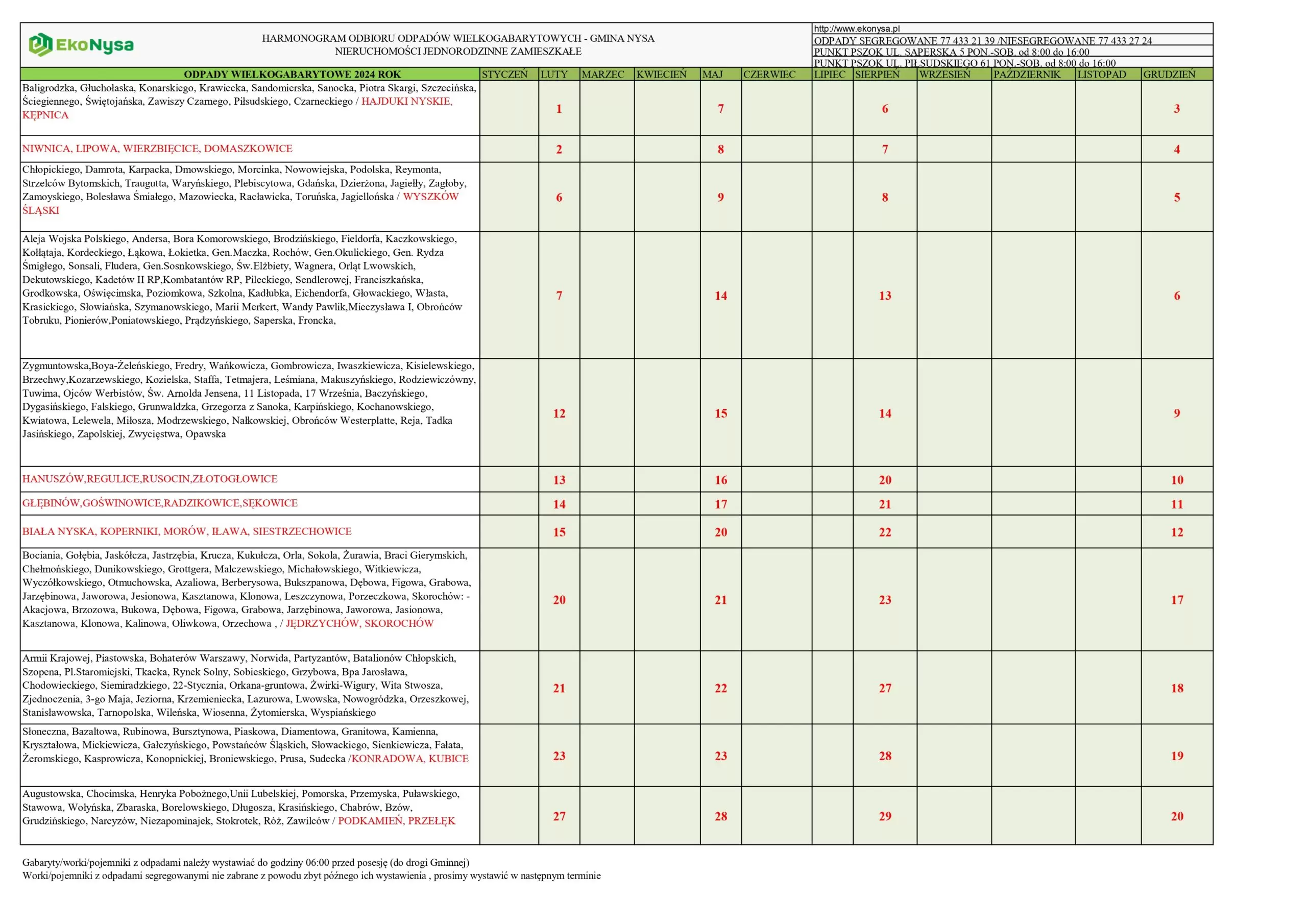 Spółka EkoNysa przygotowała harmonogram odbioru odpadów wielkogabarytowych na 2024 rok. Tabele zostały przygotowane dla zabudowy jedno i wielorodzinnej.