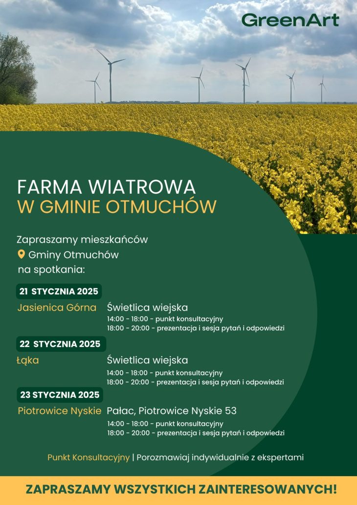 Gmina Otmuchów zaprasza wszystkich zainteresowanych mieszkańców na spotkania informacyjne dotyczące projektu farmy wiatrowej.  Szczegóły na plakacie:
