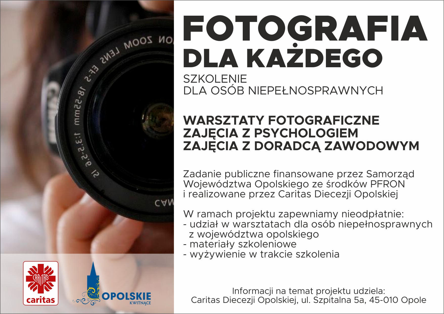 Caritas Diecezji Opolskiej realizuje projektu pt. ,,Fotografia dla Każdego”. Zadanie publiczne jest finansowane przez Samorząd Województwa Opolskiego ze środków PFRON oraz Regionalny Ośrodek Polityki Społecznej w Opolu.