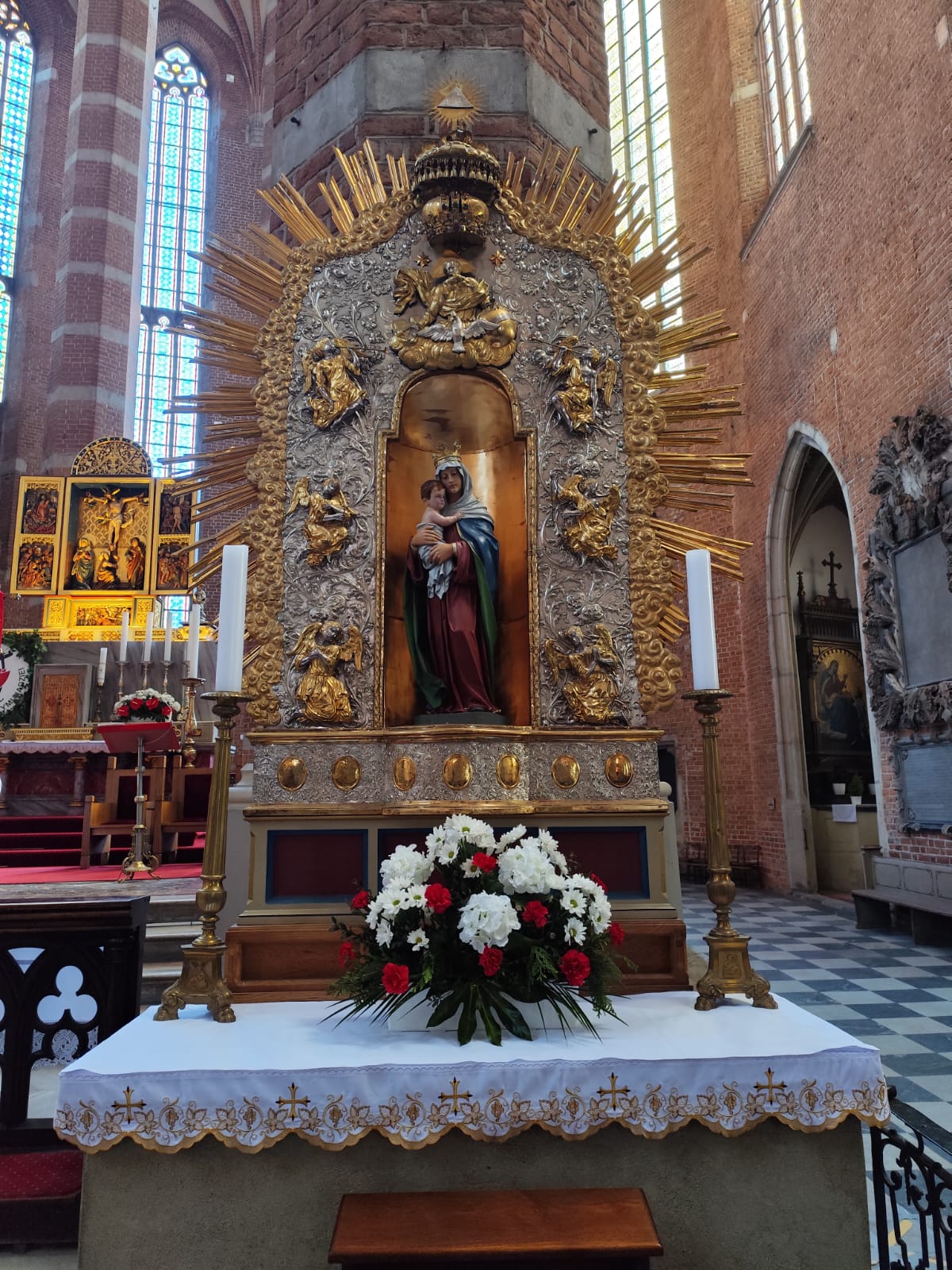 Obecnie po prawej stronie prezbiterium w barokowym ołtarzu znajduje się… figura Matki Boskiej. Skąd ta zmiana? Otóż jak nam powiedział ksiądz Dariusz Domerecki z parafii św. Jakuba i Agnieszki zmiana jest podyktowana nabożeństwami majowymi. Figura świętej Anny Samotrzeć obecnie znajduje się za gotyckim ołtarzem głównym w obejściu prezbiterium.