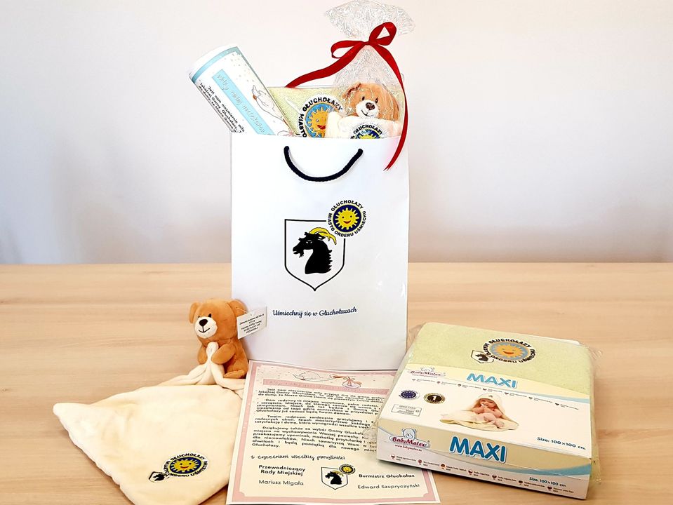 Na dobry początek przekazujemy zestaw prezentowy zawierający maskotkę przytulankę i ręcznik kąpielowy z kapturem dla niemowlaków. Niech towarzyszą Wam w tych cudownych chwilach macierzyństwa i będą pamiątką dla „nowego mieszkańca” Gminy Głuchołazy.
