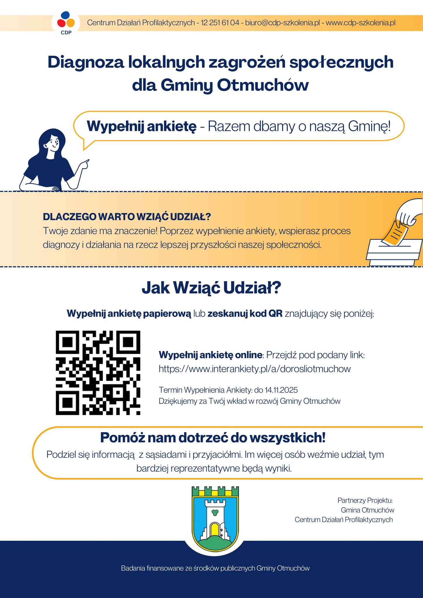 Badanie realizowane jest przez Centrum Działań Profilaktycznych na zlecenie Gminy Otmuchów. Zebrane odpowiedzi posłużą do opracowania dokumentu pn. „Diagnoza Lokalnych Zagrożeń Społecznych Gminy Otmuchów”, który stanie się podstawą do dalszych działań wspierających bezpieczeństwo i jakość życia w naszej Gminie.