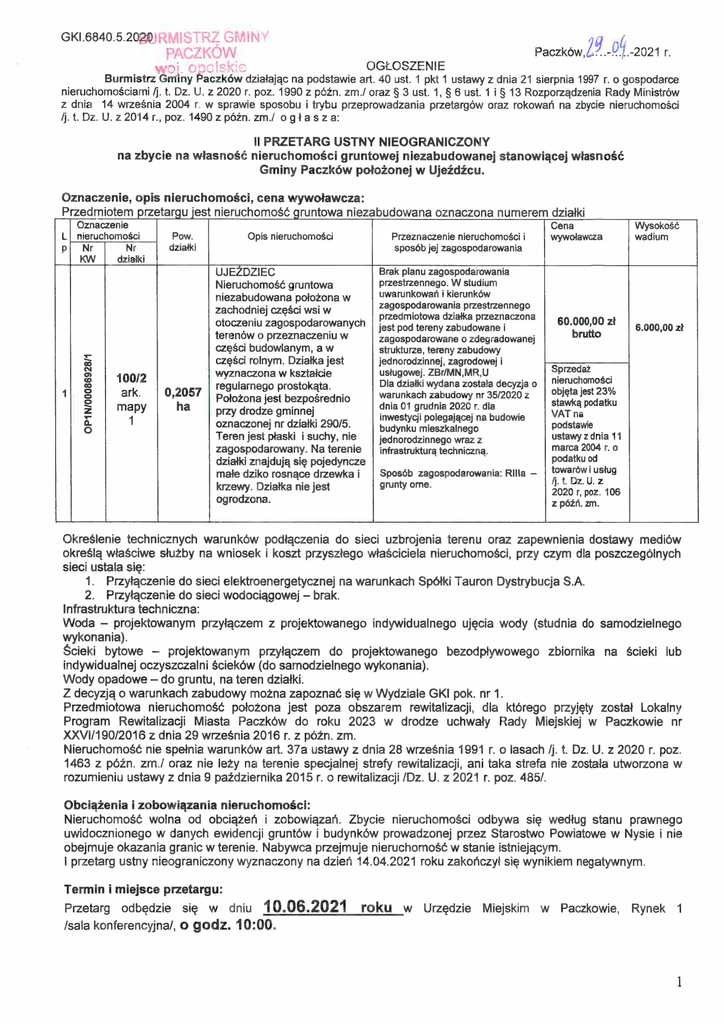 Burmistrz Gminy Paczków ogłosił II przetarg ustny nieograniczony na zbycie nieruchomości niezabudowanej położonej w Ujeźdźcu, działka 100/2 o pow. 0,2057 ha.