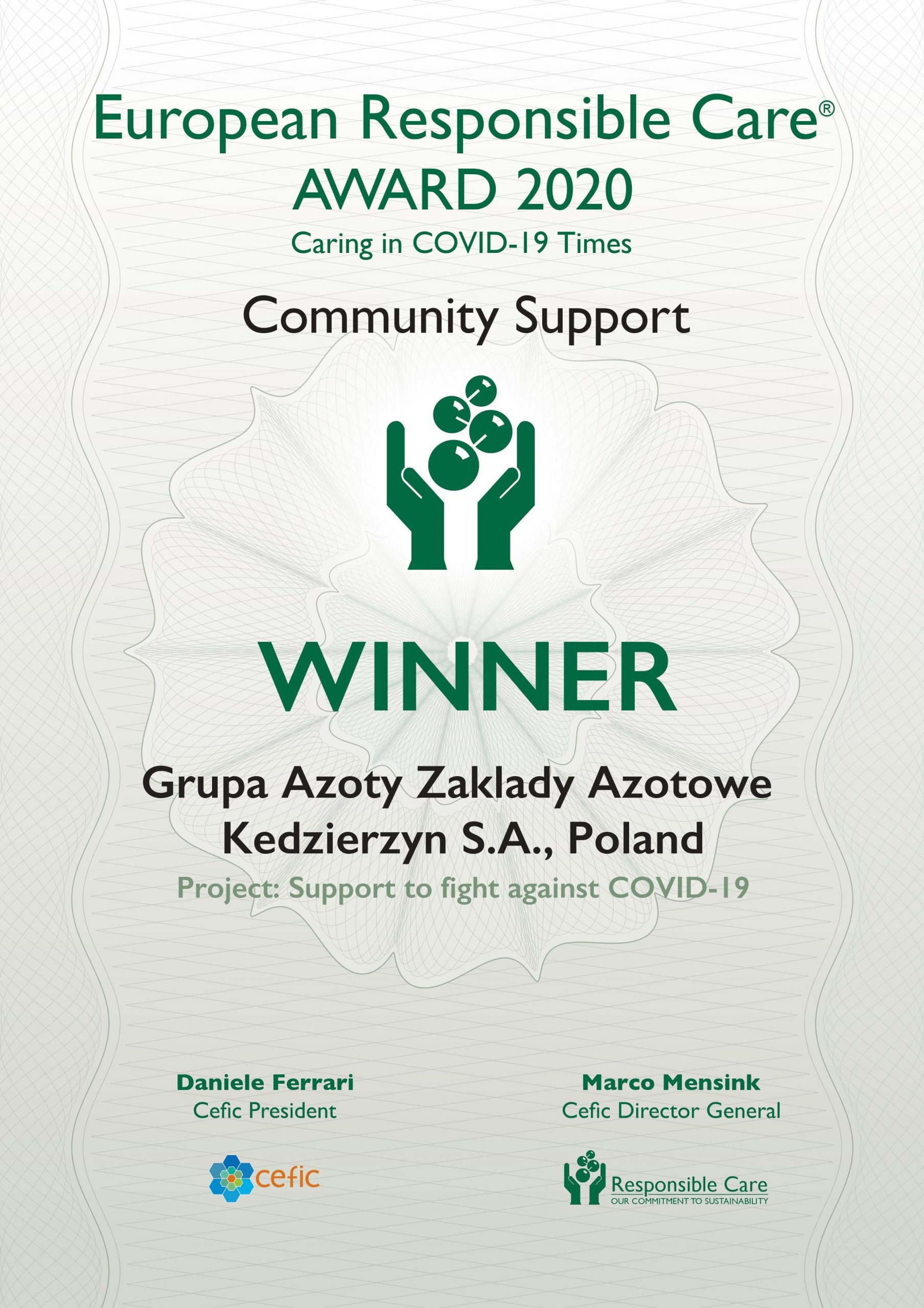 Grupa Azoty ZAK S.A. znalazła się w gronie laureatów międzynarodowego prestiżowego konkursu programu Responsible Care, zwyciężając w kategorii Community Support (wsparcie społeczności lokalnej). To pierwsza główna nagroda w konkursie w tej kategorii, dedykowana polskiemu przedsiębiorstwu.