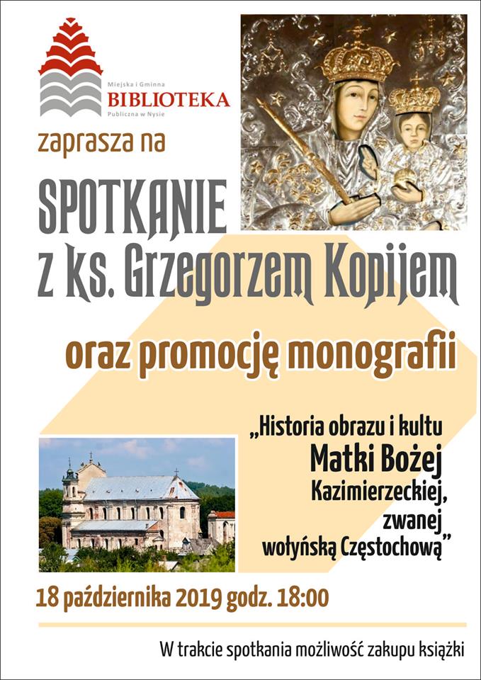 W Miejskiej i Gminnej Bibliotece Publicznej będzie miało miejsce spotkanie z księdzem Grzegorzem Kopijem. Okazją do tego będzie promocja monografii “Historia obrazu i kultu Matki Bożej Kazimierzeckiej zwanej wołyńską Częstochową”.
