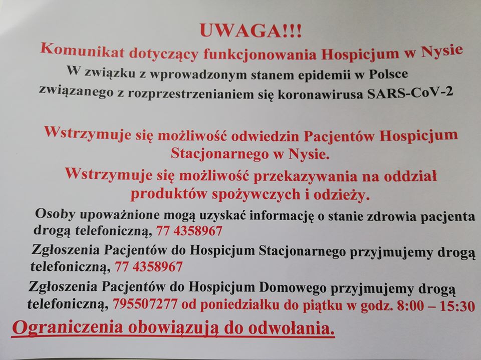 To bardzo ciężka sytuacja dla wszystkich – zagrożenie spowodowane koronawirusem wprowadziło kolejne ograniczenia w przypadku Nyskiego Hospicjum. Obecnie placówka przy ulicy Sienkiewicza w Nysie wstrzymuje możliwość odwiedzin przez pacjentów oraz możliwość przekazywania na oddział produktów spożywczych i odzieży.