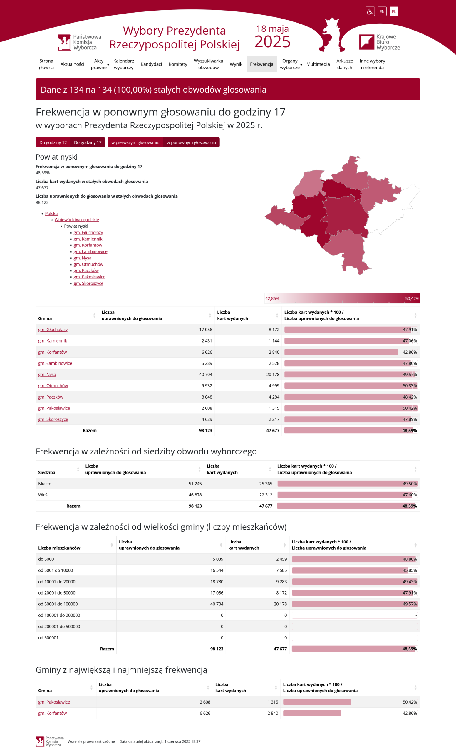 Na godzinę 17. frekwencja w Powiecie Nyskim wyniosła 48,59 %. Natomiast dwa tygodnie wcześniej frekwencja wyniosła 43,22%.