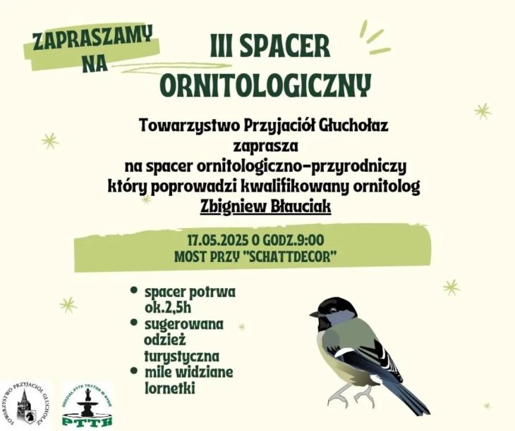 Obserwacja ptaków to nie tylko relaks, ale także sposób na rozwijanie wiedzy o przyrodzie. Oddział PTTK Tryton w Nysie zaprasza na III spacer ornitologiczny do Głuchołaz. Warto zabrać ze sobą lornetki! Szczegółowe informacje dotyczące spotkania na plakacie poniżej.