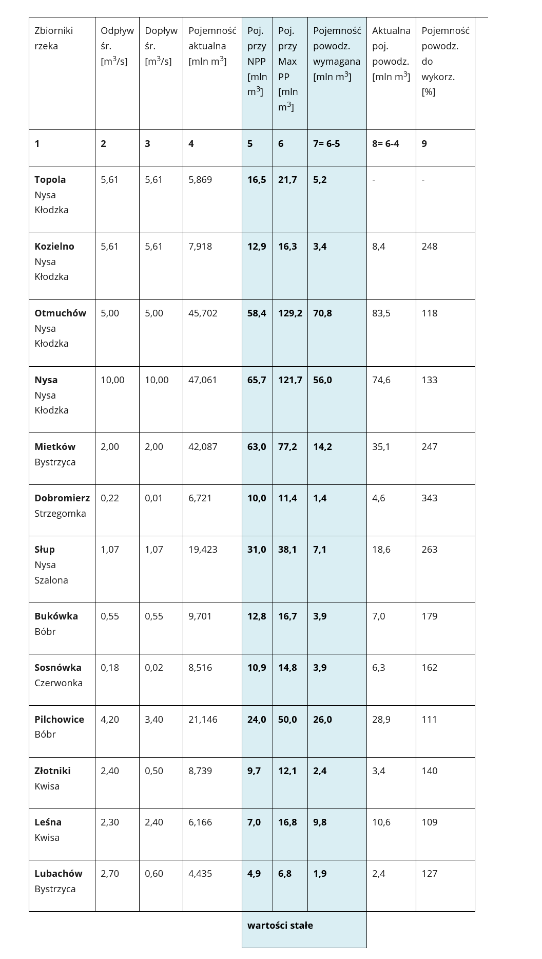 Suche zbiorniki przeciwpowodziowe nie piętrzą wody, są przygotowane do podjęcia pracy w przypadku wystąpienia opadów. Wielkość pojemności powodziowych odzwierciedla tabela poniżej.