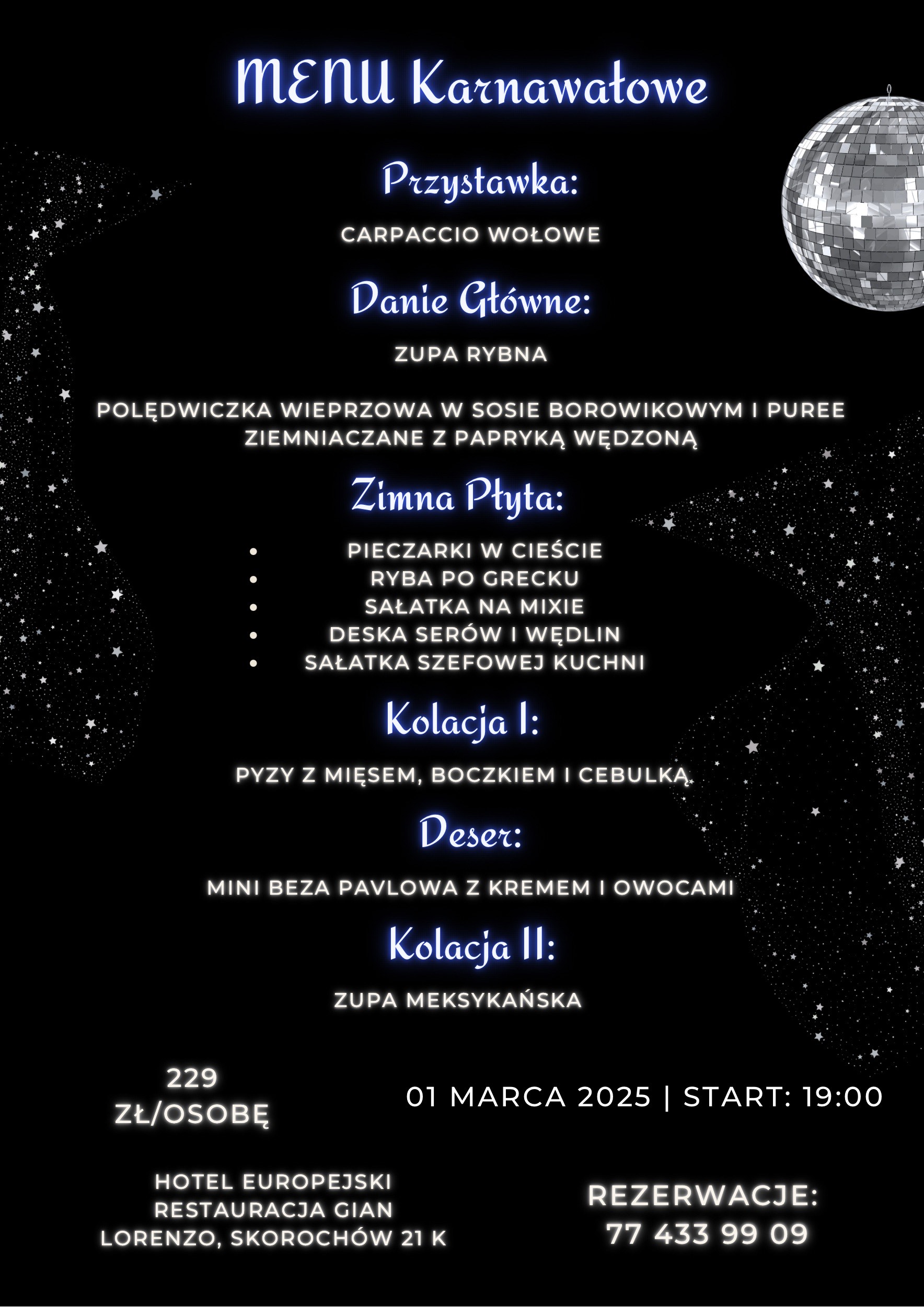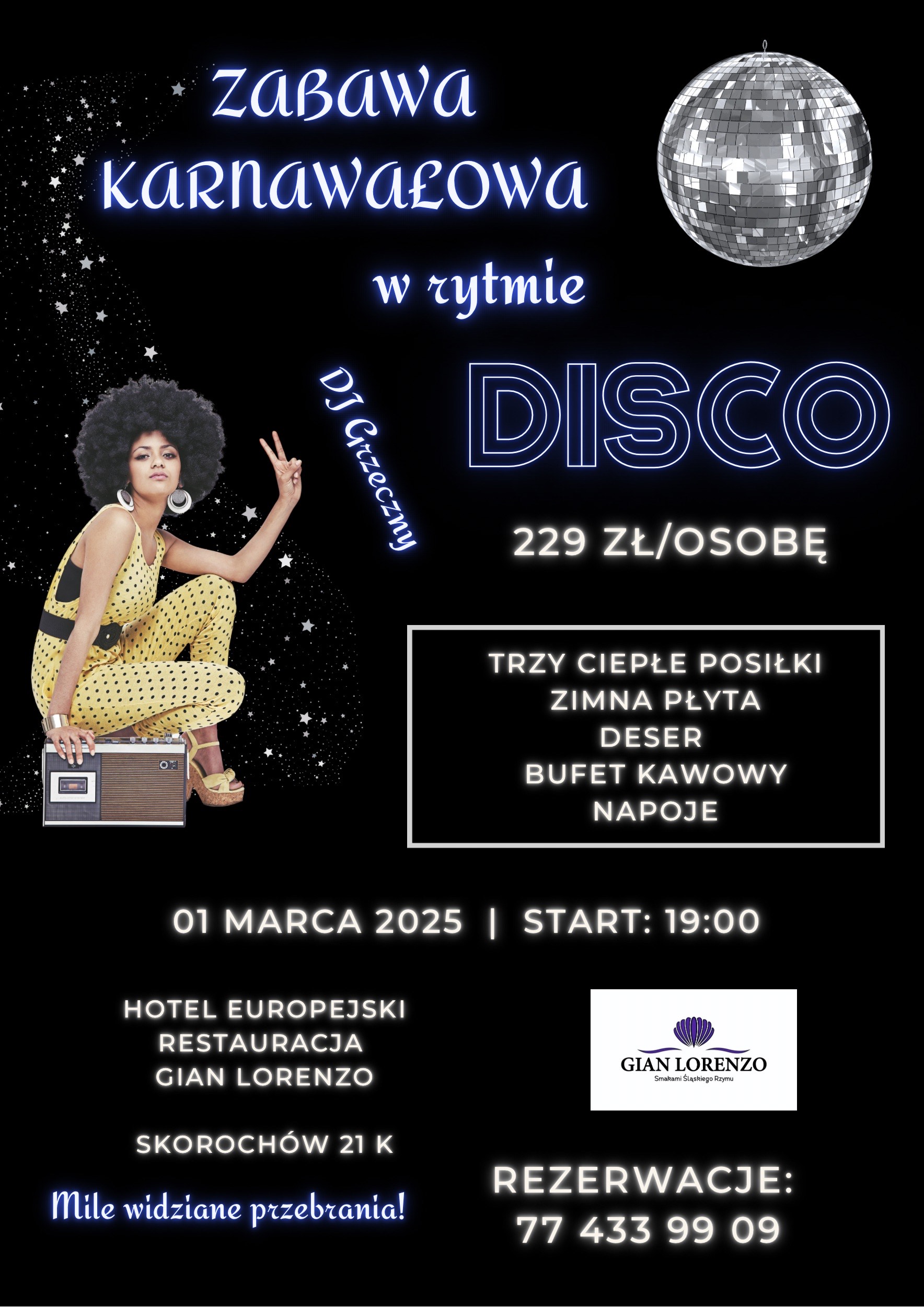 Przed nami impreza karnawałowa w stylu disco! Restauracja Gian Lorenzo przy Hotelu Europejskim w Nysie !