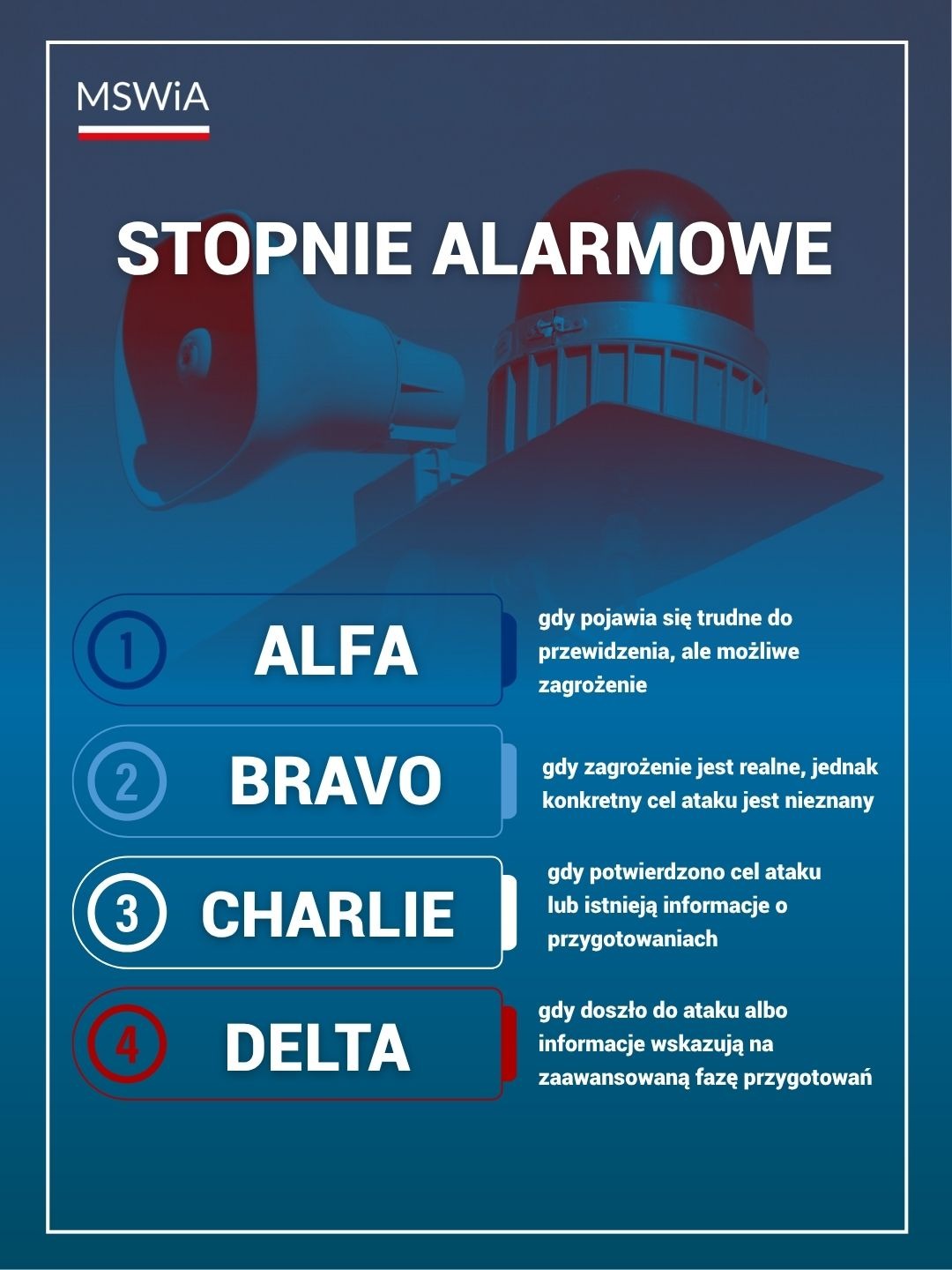 Są cztery rodzaje-stopnie alarmowe: