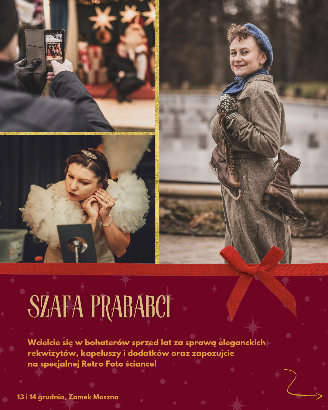 Nie zabraknie też Szafy Prababci – retro fotościanki z eleganckimi rekwizytami, kapeluszami i dodatkami w stylu przedwojennym, gdzie każdy będzie mógł przenieść się w klimat dawnych lat i zrobić sobie klimatyczne zdjęcie na specjalnie przygotowanym tle lub w zimowym plenerze. To idealna pamiątka i świetna zabawa w świątecznym nastroju.