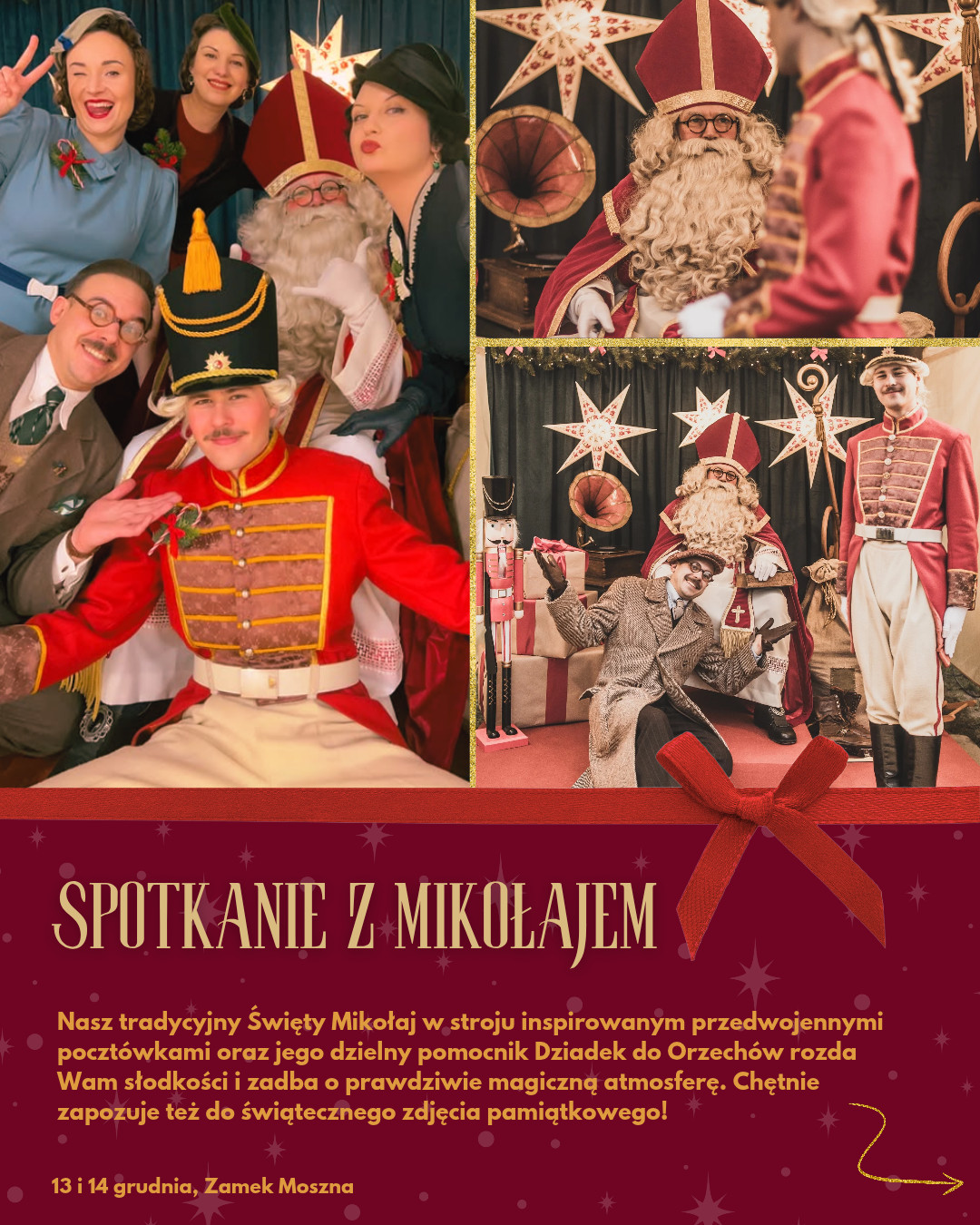 Spotkanie ze Świętym Mikołajem w stroju inspirowanym dawnymi pocztówkami, któremu towarzyszy dzielny Dziadek do Orzechów – rozdają słodkości i rozmawiają z dziećmi oraz dorosłymi, tworząc ciepłą, rodzinną atmosferę. Dzięki specjalnej fotościance zdjęcia z tego dnia nabiorą niepowtarzalnego klimatu.