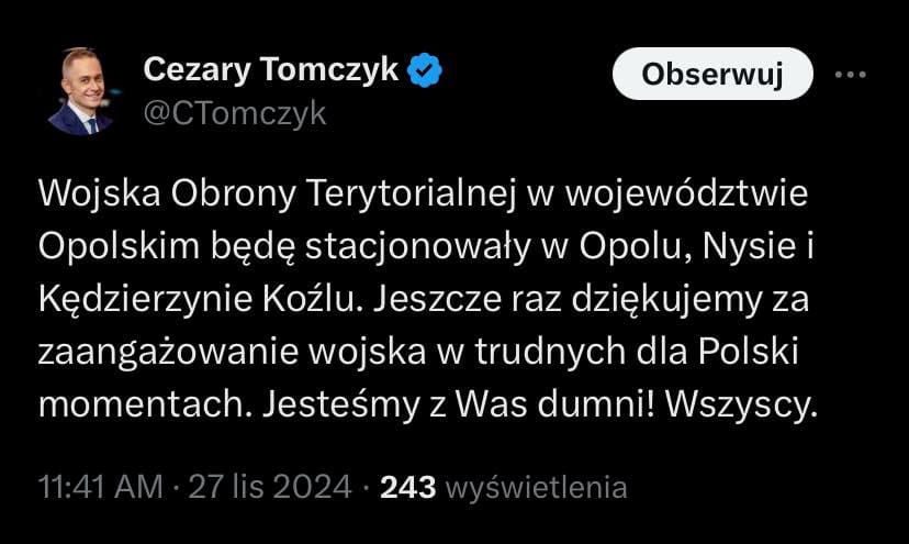 Jednostka Wojsk Obrony Terytorialnej powstanie w Nysie. W środę, 27 listopada informację o utworzeniu nowej jednostki Wojsk Obrony Terytorialnej w Nysie potwierdził Cezary Tomczyk, sekretarz stanu w Ministerstwie Obrony Narodowej. Wcześniej taka deklaracja padła wprost od premiera Władysława Kosiniaka-Kamysza podczas wizyty w Nysie.