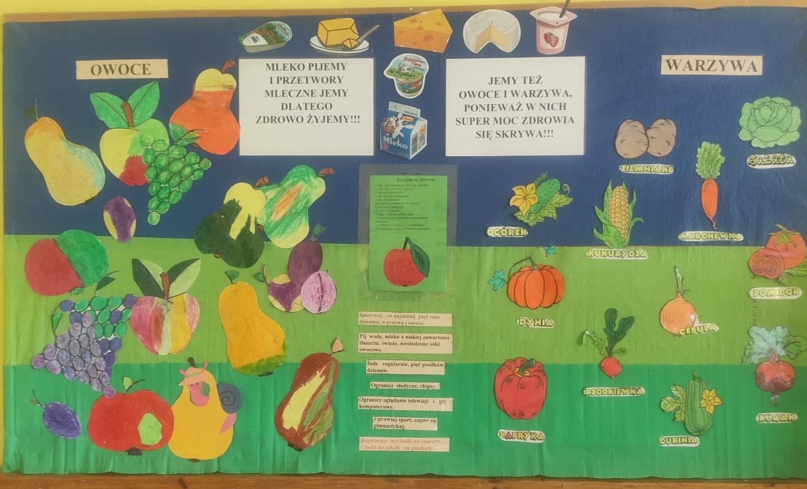 W ramach szerzenia dietetycznej świadomości uczniowie w trakcie zajęć stacjonarnych otrzymują poczęstunki złożone z porcji wybranych warzyw, owoców bądź soku oraz mleka. Ogromna rolę odgrywają działania w świetlicy szkolnej. W ramach programu powstały uczniowskie prace wykonane głównie techniką pastelową, które z dumą prezentujemy na ściennej gazetce.