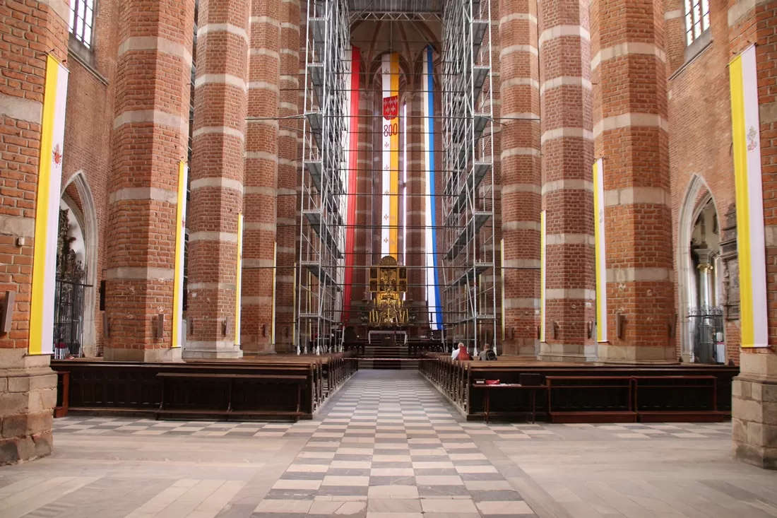 Prace trwają także wewnątrz gdzie znajdują się blisko 30-metrowej wysokości rusztowania. Konserwatorzy niemal już zakończyli pracę w nawie głównej i nawach bocznych. Aktualnie rusztowania rozstawione są w prezbiterium oraz w jego obejściu. Dodatkowo został zabezpieczony gotycki tryptyk, który obecnie pełni funkcję Ołtarza Głównego.