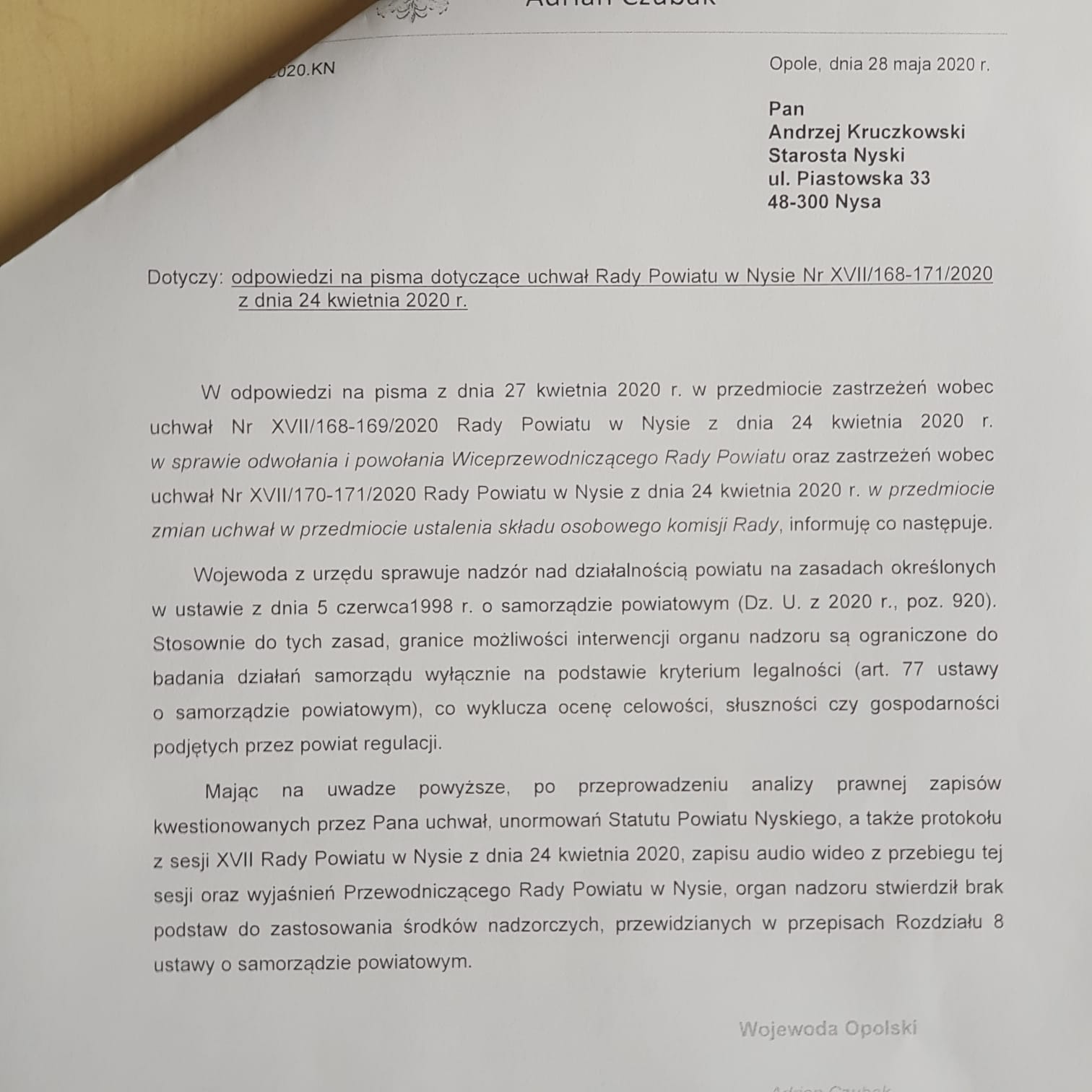 Następnie na początku maja, wojewoda Adrian Czubak wszczął postępowanie nadzorcze w sprawie uchwały Rady Powiatu.