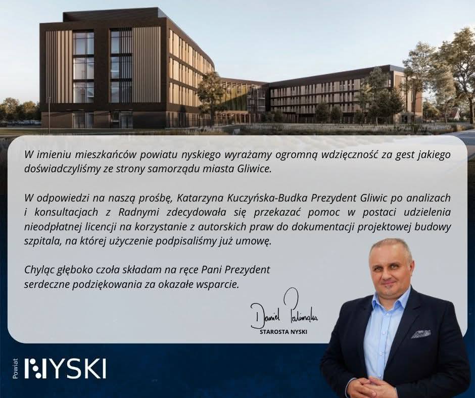 Dziś już wiadomo, że starostwo projekt pozyskało dzięki przychylności rady w Gliwicach. Projekt szpitala został przekazany bezpłatnie o czym w mediach społecznościowych poinformował Daniel Palimąka:
