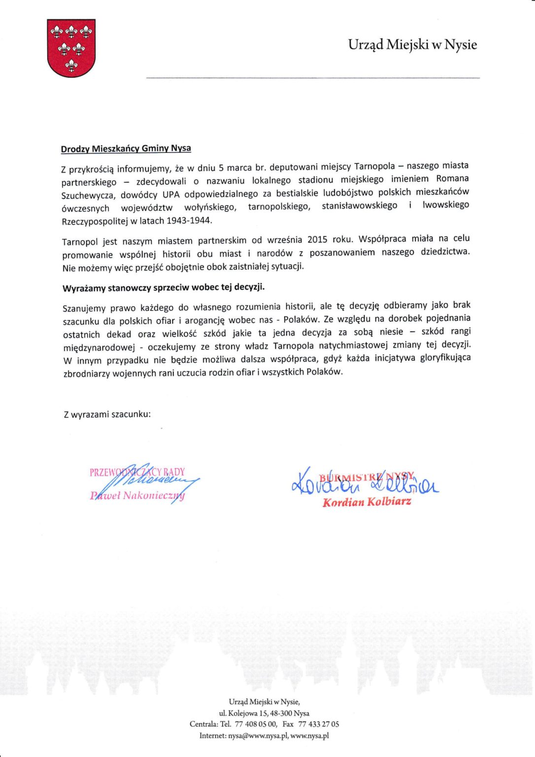 Przypomnijmy, że deputowani miejscy Tarnopola 5 marca zdecydowali o nazwanie stadionu miejskiego imieniem Romana Szuchewycza – dowódcy UPA, który był odpowiedzialny m.in. za ludobójstwo Polaków na Wołyniu. Nas mieszkańców Nysy bardzo zabolało to co wydarzyło się w Tarnopolu, dlatego że większość z nas pochodzi z Kresów. Moja rodzina również cierpiała z powodu decyzji Romana Szuchewycza – mówi burmistrz Kordian Kolbiarz.