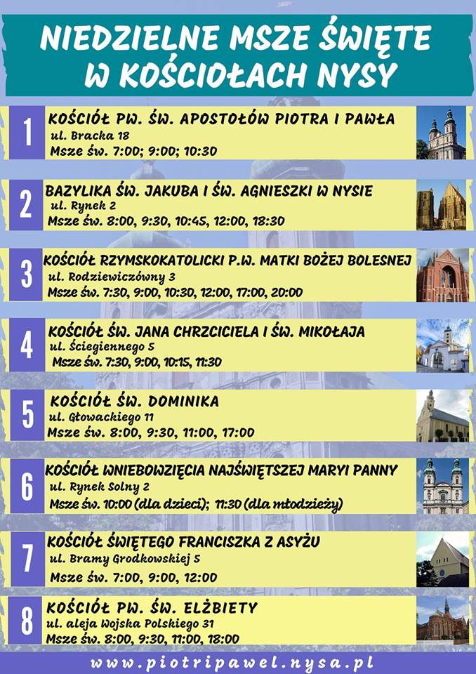 Parafia przygotowała zestawienie graficzne dotyczące poszczególnych kościołów w Nysie, wraz ze szczegółową rozpiską o której godzinie zaczyna się msza święta.