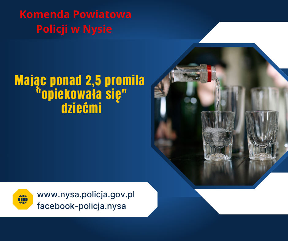 W sobotę, 28 marca br., około godziny 19.00 dzielnicowi, wykonując rutynowe obowiązki służbowe, odwiedzili jedno z mieszkań, aby skontrolować sytuację rodzinną osób tam zamieszkujących. Na miejscu zastali 34‑letnią kobietę oraz dwoje dzieci. W trakcie rozmowy funkcjonariusze wyczuli od kobiety silną woń alkoholu. Mieszkanka Nysy zaprzeczała, że jest pod jego wpływem, twierdząc jednocześnie, że właściwie opiekuje się niespełna 2‑letnim synem. Z uwagi na podejrzenie nietrzeźwości policjanci przeprowadzili badanie alkomatem, które wykazało ponad 2,5 promila alkoholu w organizmie.