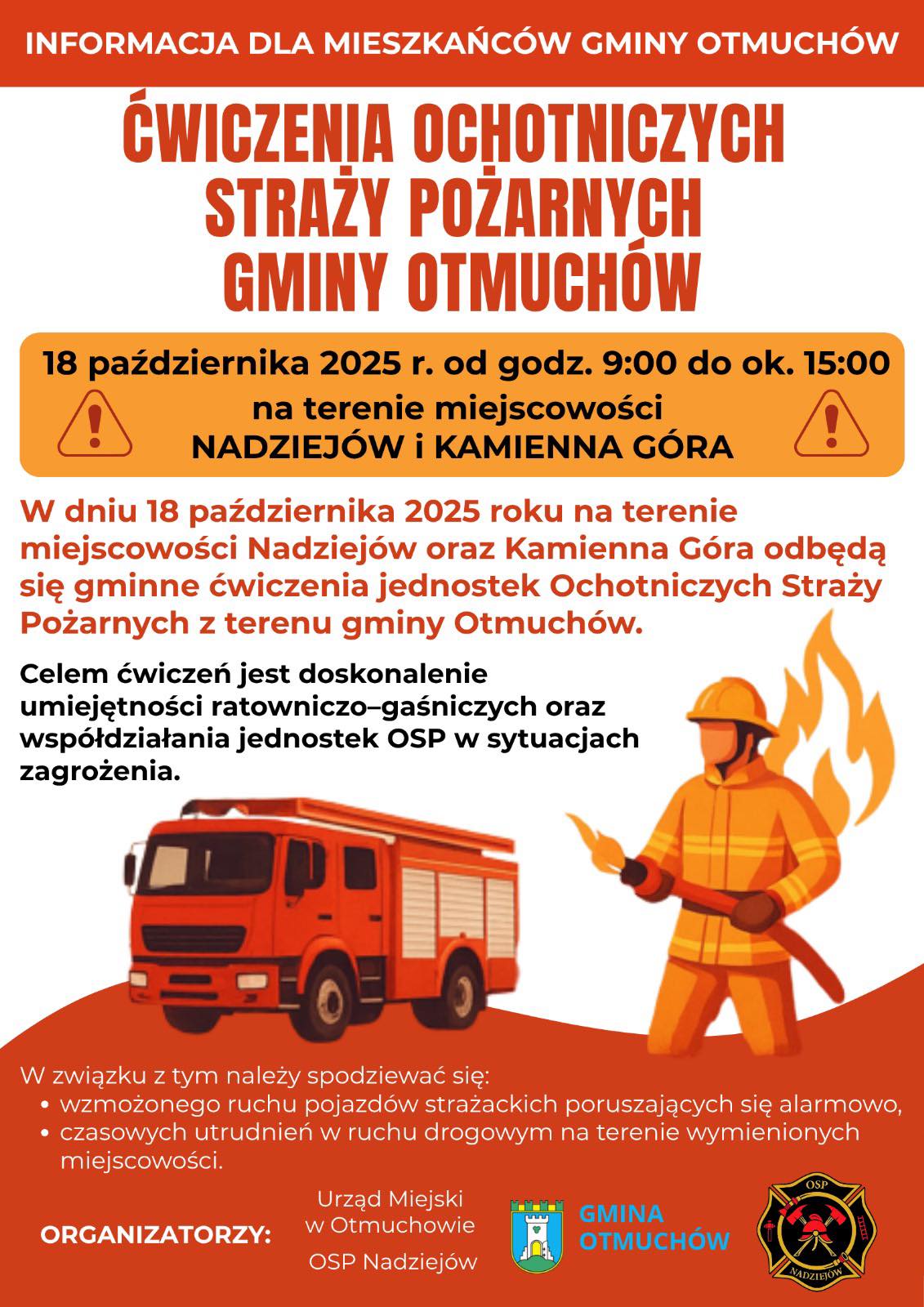 Strażacy ponownie będą ćwiczyć! Tym razem ćwiczenia obejmuję jednostki OSP z terenu Gminy Otmuchów. Celem wydarzenia jest doskonalenie umiejętności ratowniczo–gaśniczych oraz współpracy służb w sytuacjach zagrożenia. Jak przypominają organizatorzy – w godzinach porannych mogą wstąpić problemy komunikacyjne.